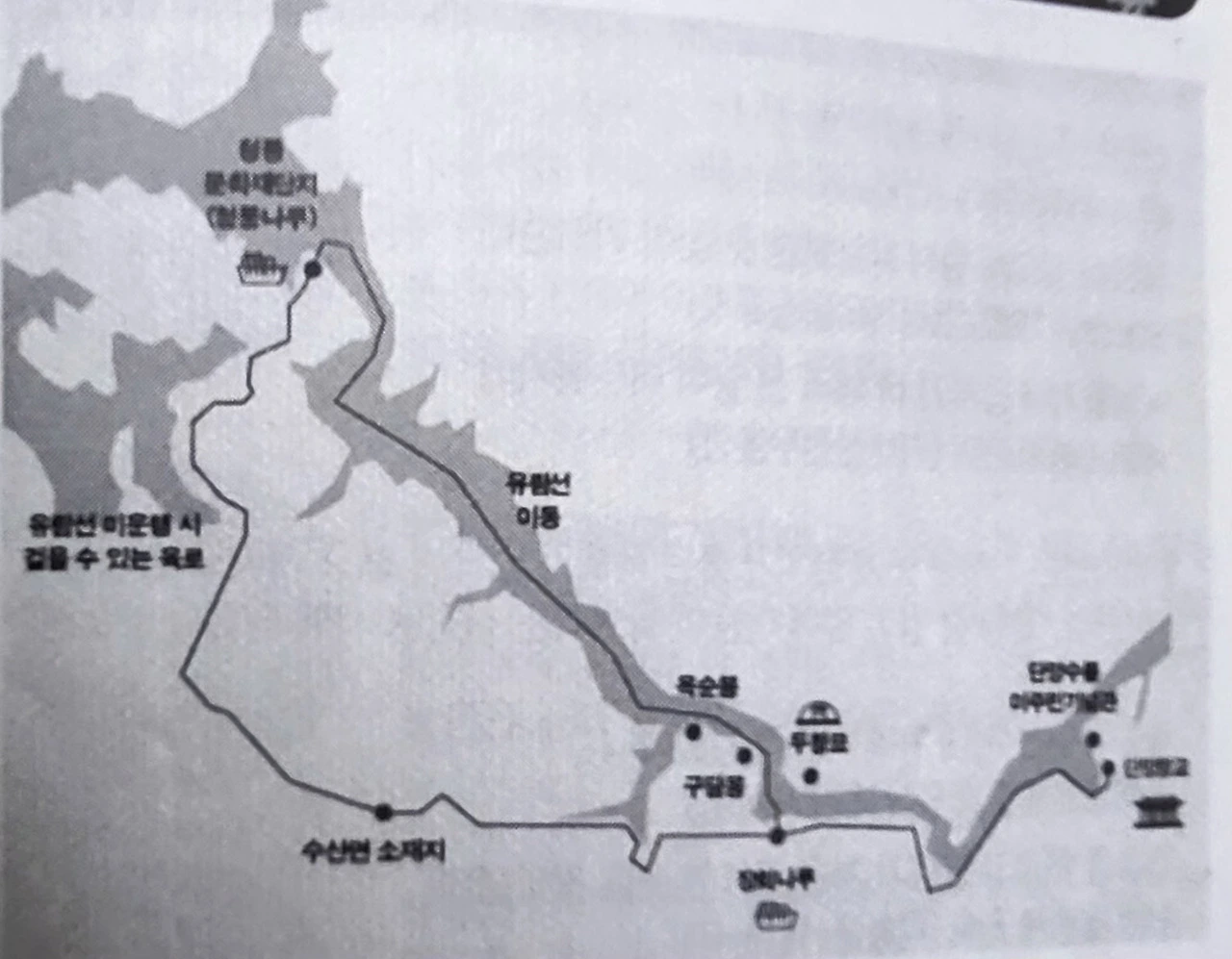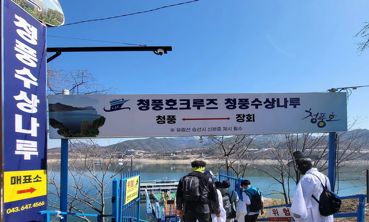 청풍나루터에서 청풍크루즈호에 승선하여 장회나루까지 이동한다. 충주댐 건설로 불가피하게 옛길이 수몰되며, 발목의 휴식 겸 드디어 물 위로 길이 이어진다.