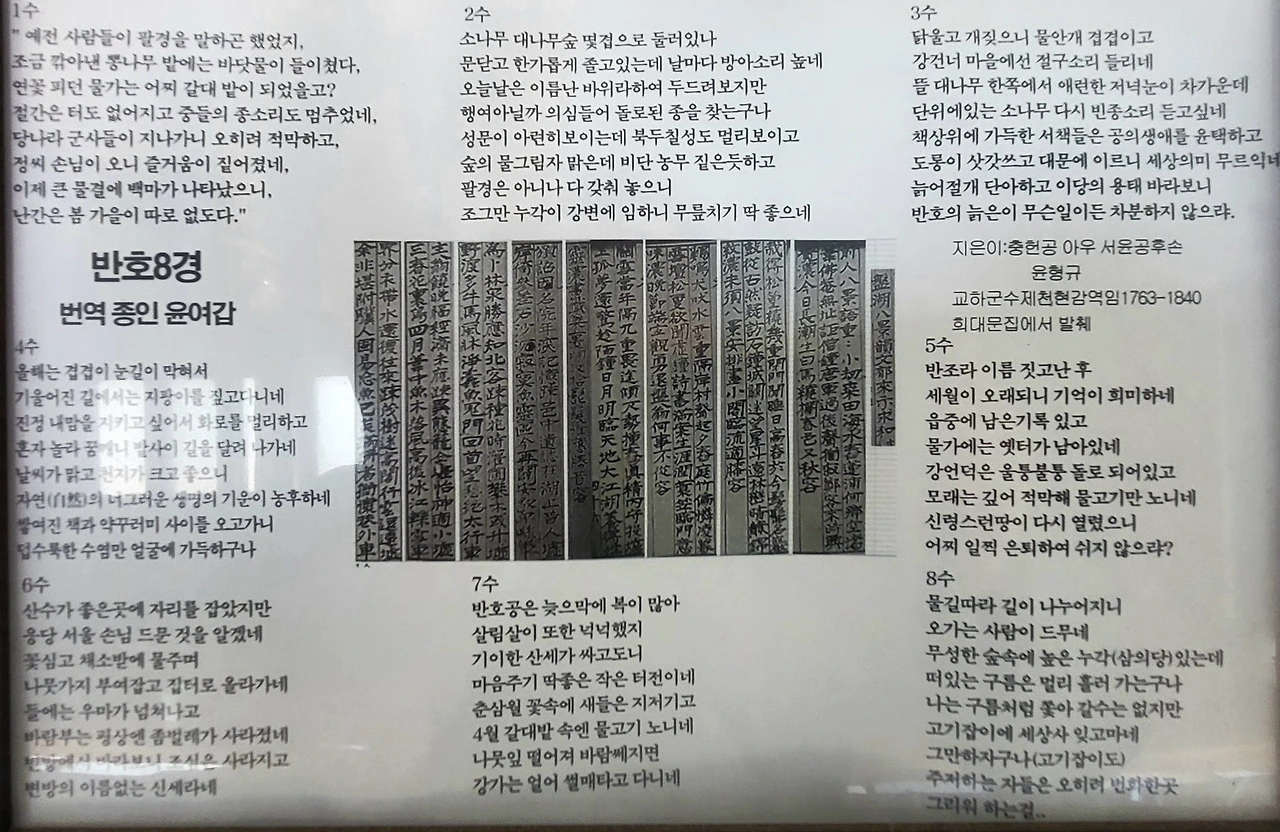 팔경 이야기를 들으며 문득 고향집이 떠올랐다. 겸재 정선 선생이 1750년경 현 반호정사 삼의당 배경지인 반주정사를 다녀가시면 남긴 임천고암(林川鼓巖) 배경지, 나의 7대 선조 반호 윤광안(盤湖 尹光顔) 선생께서도 반호8경(盤湖八景)을 시문으로 남기셨다. 이한방 박사님의 특강속의 소상팔경에서 관동팔경으로, 단양팔경에서 반호팔경으로 이어지는 이 팔경 문화가 어느새 나의 뿌리와도 닿아 있었다.