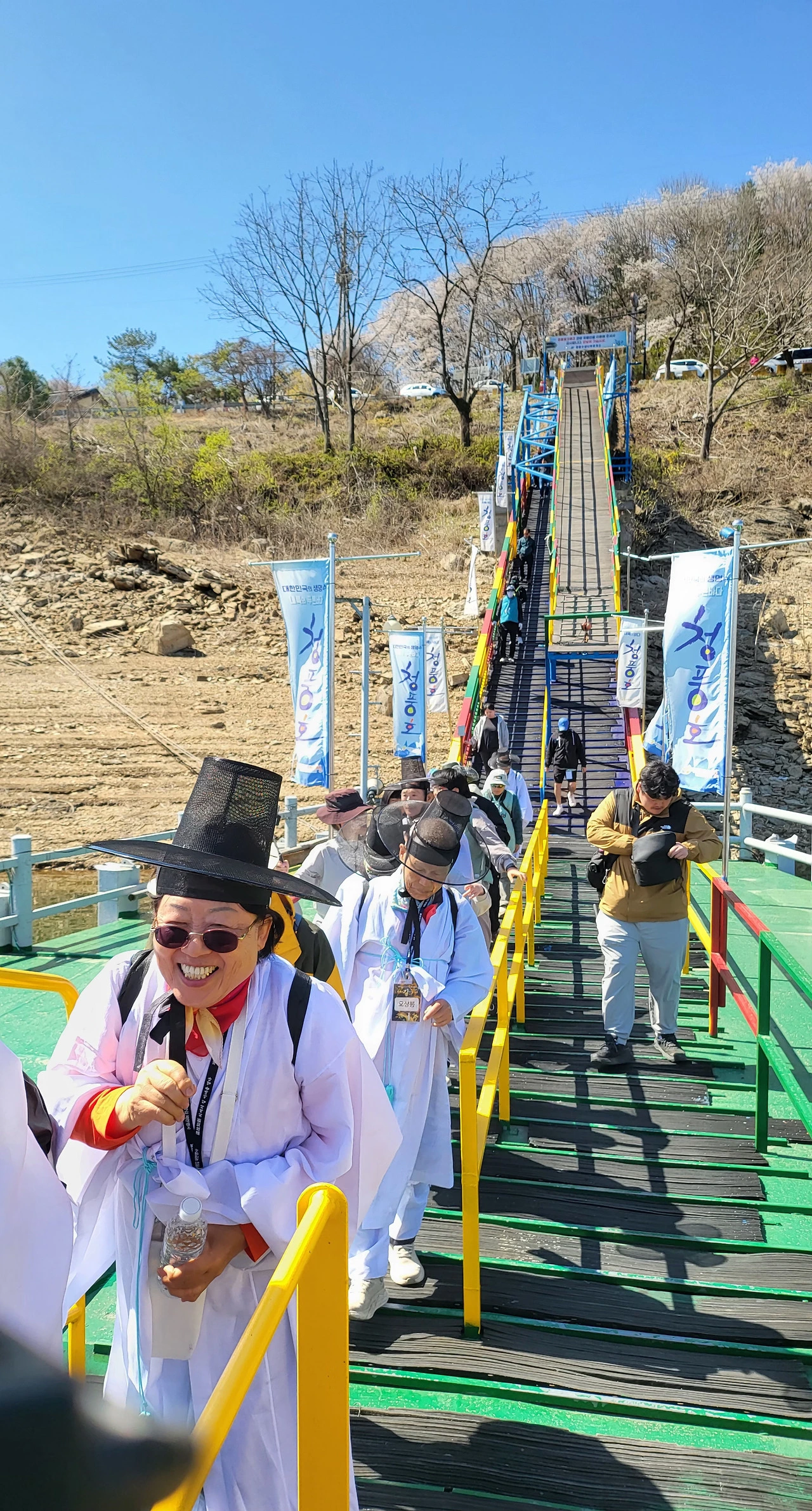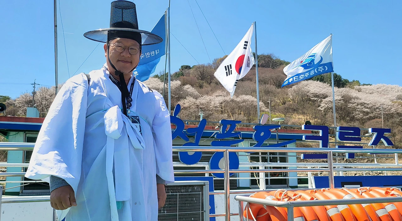 도포 자락을 여미며 선착장 계단을 내려갔다. 청풍호크루즈 청풍수상나루, 청풍에서 장회나루까지, 붉은 화살표 하나가 오늘의 길을 가리키고 있었다. 갓을 쓰고 도포를 입은 재현단 일행이 하나둘 배에 오르는 모습은 어느 시대의 풍경인지 알 수 없었다. 조선인지 현대인지, 청풍호의 봄 햇살 아래 그 경계가 흐릿해졌다.