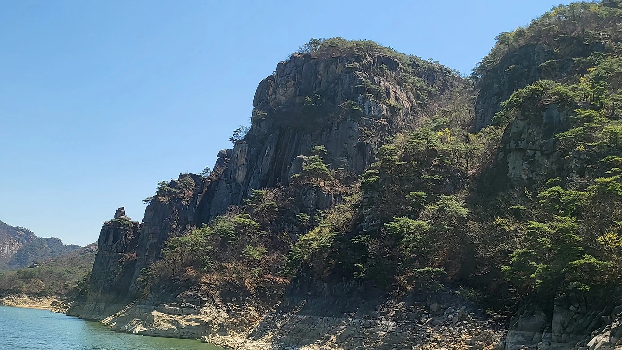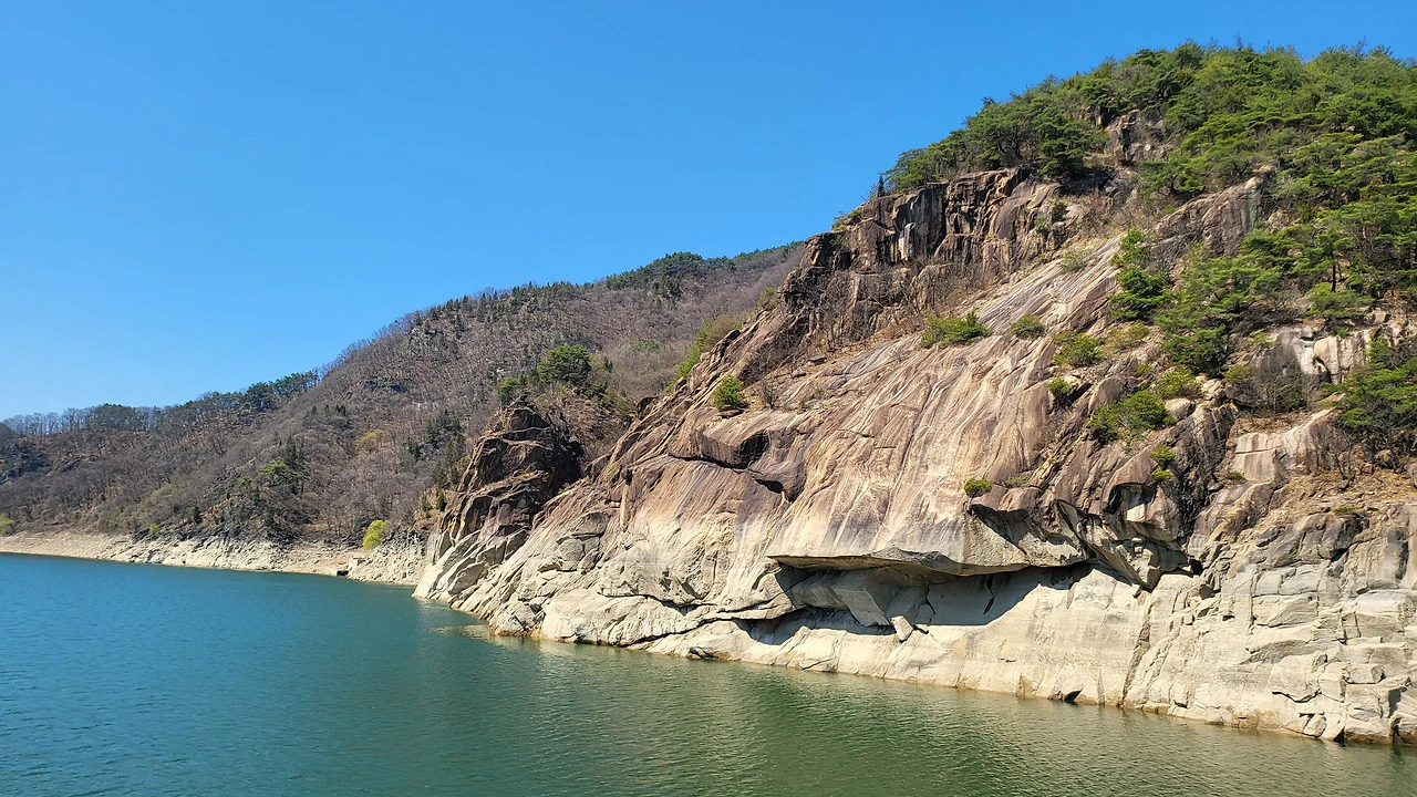 장회나루가 가까워질수록 풍경은 점점 겸재선생이 다녀가신 내 고향 백마강 임천고암 절벽처럼 깊어지며 탄성이 저절로 커졌다. 청풍호 양쪽으로 웅장한 암벽들이 차례로 모습을 드러냈다. 주상절리처럼 세로로 갈라진 절벽, 물가까지 완만하게 흘러내린 너른 암반, 억만 년 세월이 빚어낸 형상들이었다. 수위가 낮아진 자리에 하얗게 드러난 암석층이 이 호수의 깊이를 짐작케 했다.