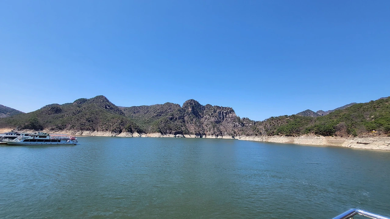 배 안에서 방송이 흘러나왔다. 충청도 사람 특유의 구수한 말투가 섞였지만 빠르고 또렷한 어투로 지역 지명 유래를 설명하는 목소리였다. 금수산(錦繡山), 비단에 수를 놓은 듯 아름답다 하여 붙여진 이름이라 했다. 퇴계 선생이 그 암벽의 모습을 보고 직접 명명했다 전한다. 금수산 안쪽 한영지 골짜기에는 삼복더위에 얼음이 언다는 신비로운 얼음골이 있다 했다. 갑판 위 사람들이 일제히 난간으로 몰려들었다. 카메라와 핸드폰이 산을 향했다.