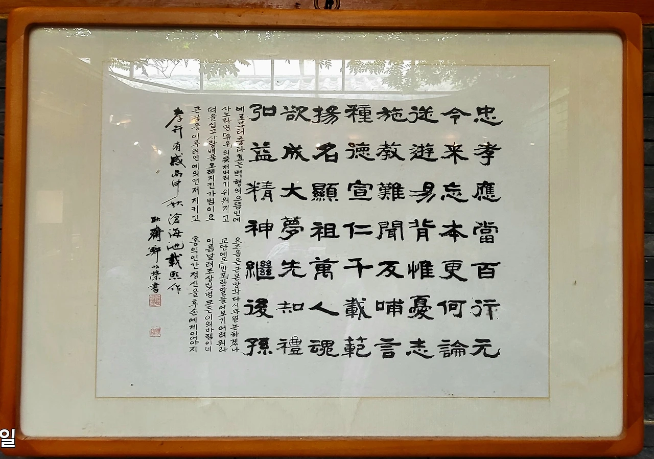 기쁜 마음으로 인사를 드리고 토속촌 대문을 나서는데, "예로부터 충과 효는 백행의 으뜸인데 덕을 심고 사랑 베풂 오래지킨 가범이요, 큰 꿈 이루러면 예의먼저 지키고 홍익인간 정신을 후손에 이어야지" 족자의 멋진 한시 읽으며 문을 나선다.