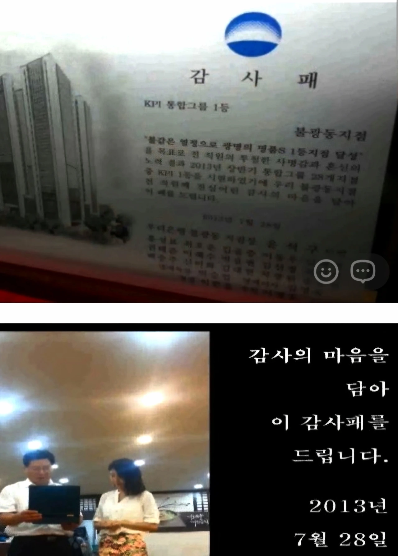 "불같은 열정으로 광명의 명품 S 1등 지점 달성"을 목표로 전 직원의 투철한 사명감과 혼신의 노력 결과 2013년 상반기 통합그룹 28개 지점 중 1등을 시현하였기에 우리 불광동지점 전 직원께 진심 어린 감사의 마음을 담아 이 패를 드립니다. 2013.7.28. 지점장 ○○○ 드림