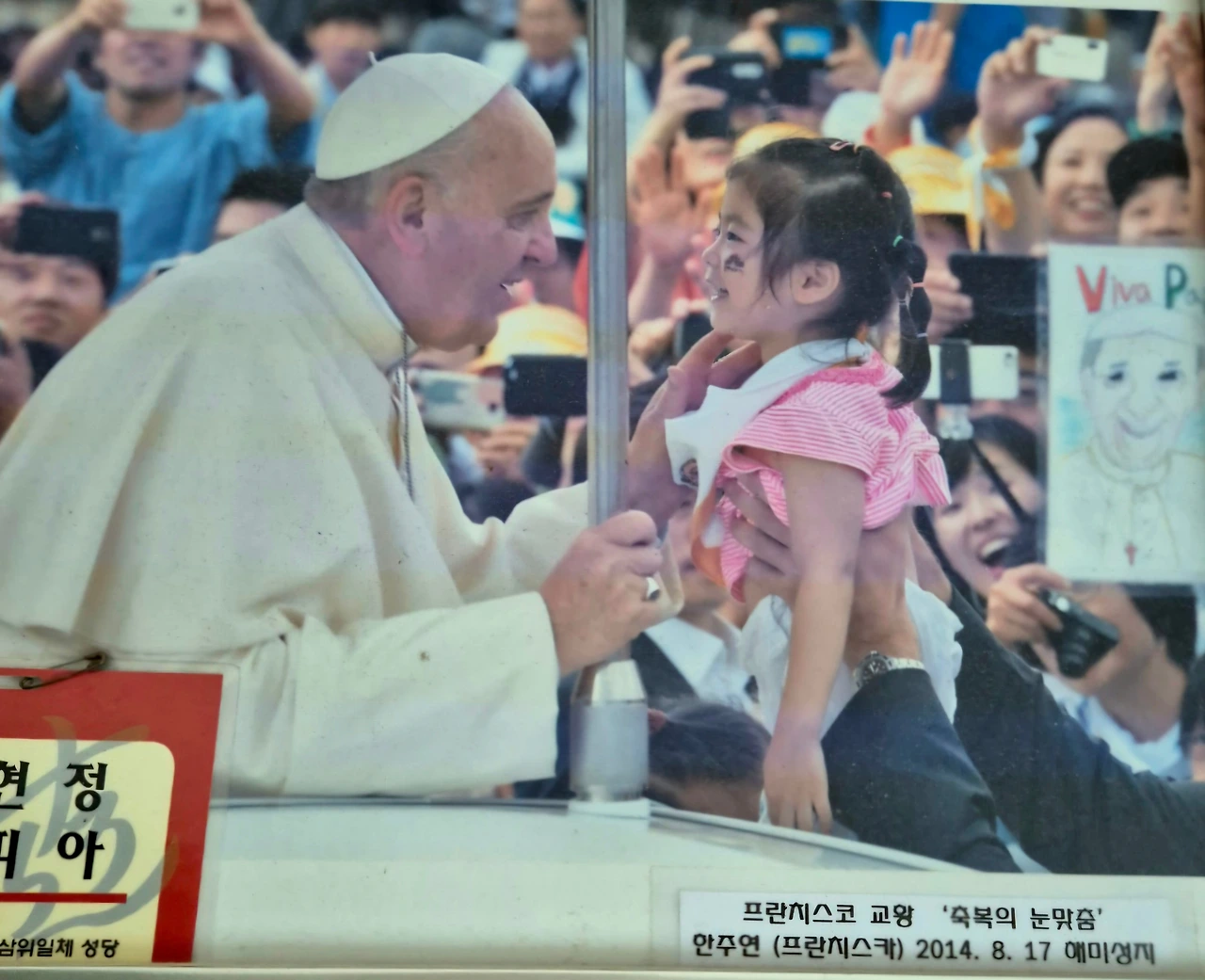 그 시기 당진 청년 성도대회에 교황님의 품에 안긴 고모의 증손녀, 이종사촌 누이는 늘 카톡 대문사진을 장식하고 자랑스러워했다. 어찌 보면 교황님을 통해 6.25 직후 중부전선 학도병으로 징집되어 생사도 모르다가 90년대 중반 전사 후 현충원에 안장된 고모부의 유복녀의 마음을 손녀가 안김으로써 위로받았다고 할까. 당시 그 장면은 많은 신문 등 토픽 중의 토픽 사진이었다. 우연이었겠지만 예쁜 아가를 듬뿍 안아주시고 격려를 아끼지 않으셨던 그 온후하신 교황님은 개인적으로 3년 1개월을 현지에 근무했던 북한에도 꼭 한 번은 가보고 싶어 했지만 성사되지는 못했지만, 늘 어려운 우리 사회 약자에게 함께했고 평화를 구원했다.