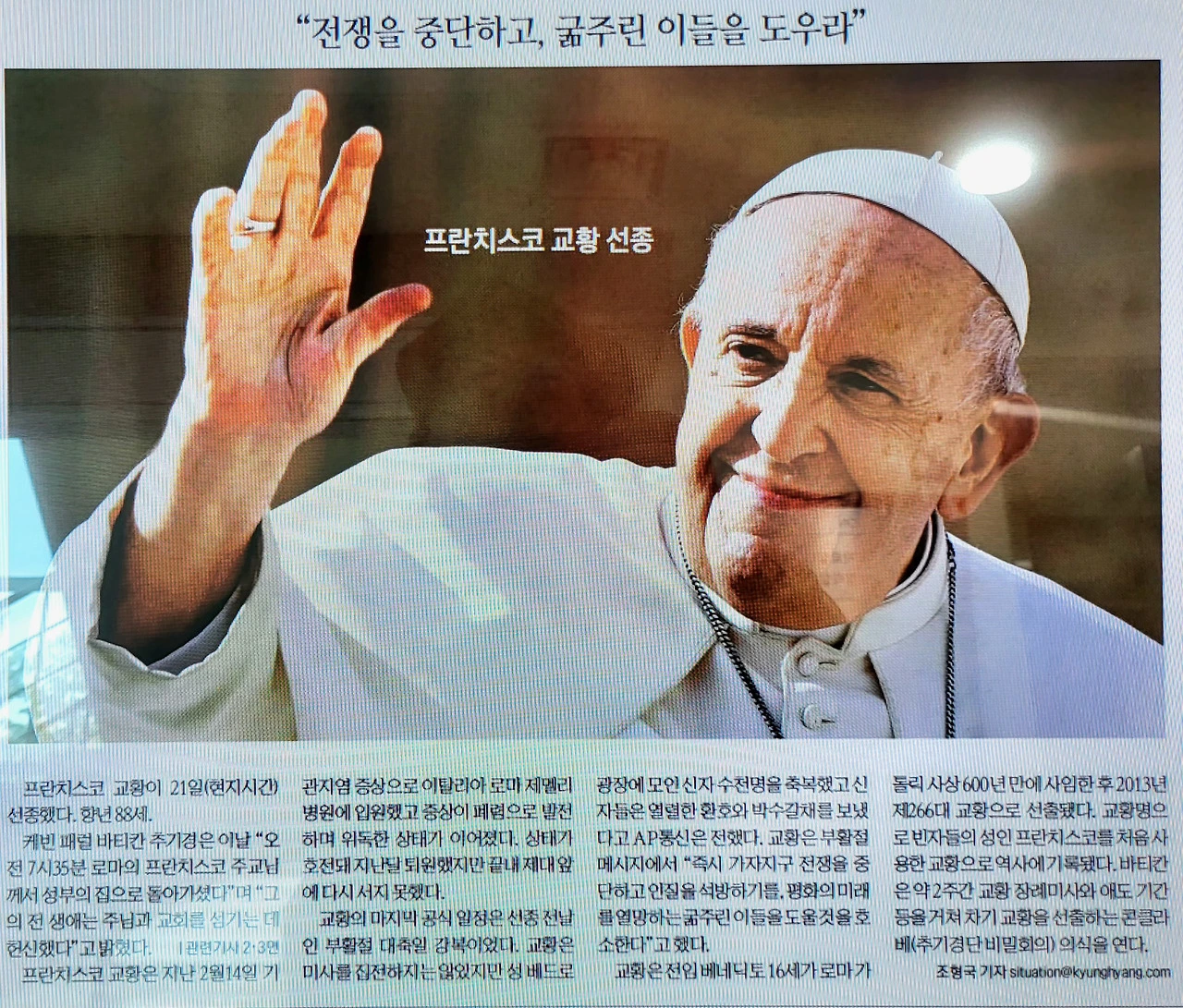 그럼에도 고령의 프란치스코 교황님은 지구상 수많은 신도들의 염려에도 불구하고 하늘로 가시는 긴 여정이 되었다. 부디 영면하시길 공교롭게도 부처님 오신 날 두 손을 모아 기도드린다.