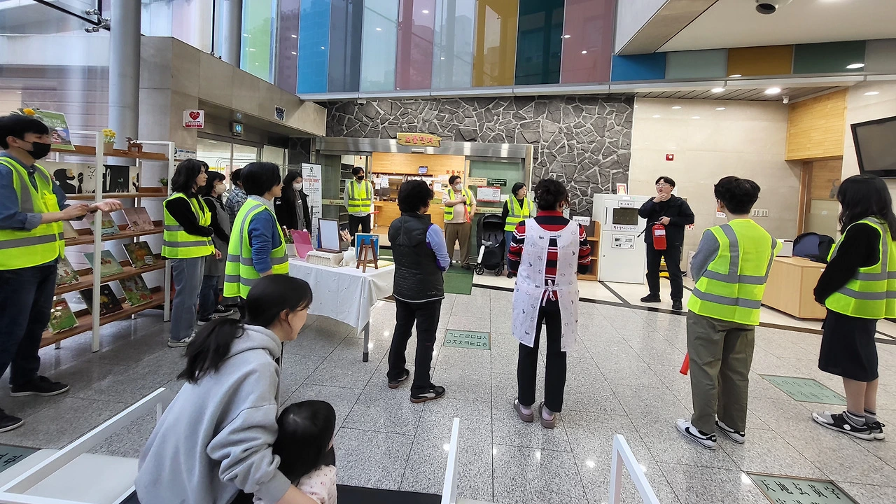 그렇게 평화롭던 금요일 이 시간, 예상치 못한 일이 있었다. 어린이 도서관 입실 신문을 펼치고 읽던 중, 오전 10시 정각이 되자 갑자기 비상벨이 울린 거다. 부원장님으로 보이는 분이 "모두 1층으로 대피하세요!" 하고 크게 외치자, 각 층에 있던 사람들이 일제히 1층 로비로 모였다.