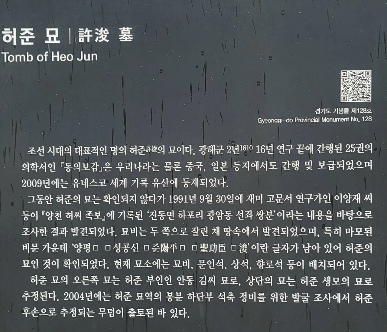 3년 전 조계사 진관스님께서 보내주신 사진 덕분에 이곳에 묘소가 있음을 알고 있었지만, 그동안 TV 드라마를 통해 허준 선생이 경남 산청 출신이라는 막연한 인식이 없지 않았습니다. 그러나 현장에서 후손 허현강 선생의 설명을 듣고 비로소 드라마 작가의 오류였음을 깨달았습니다.