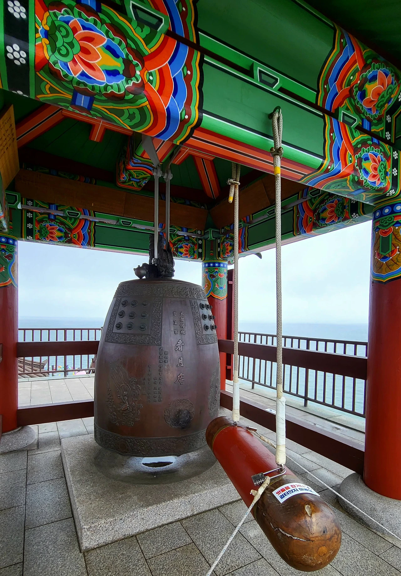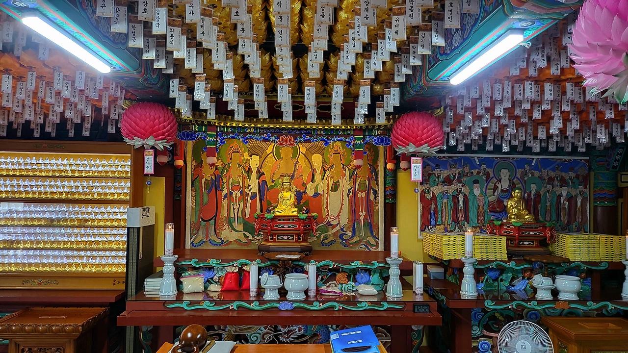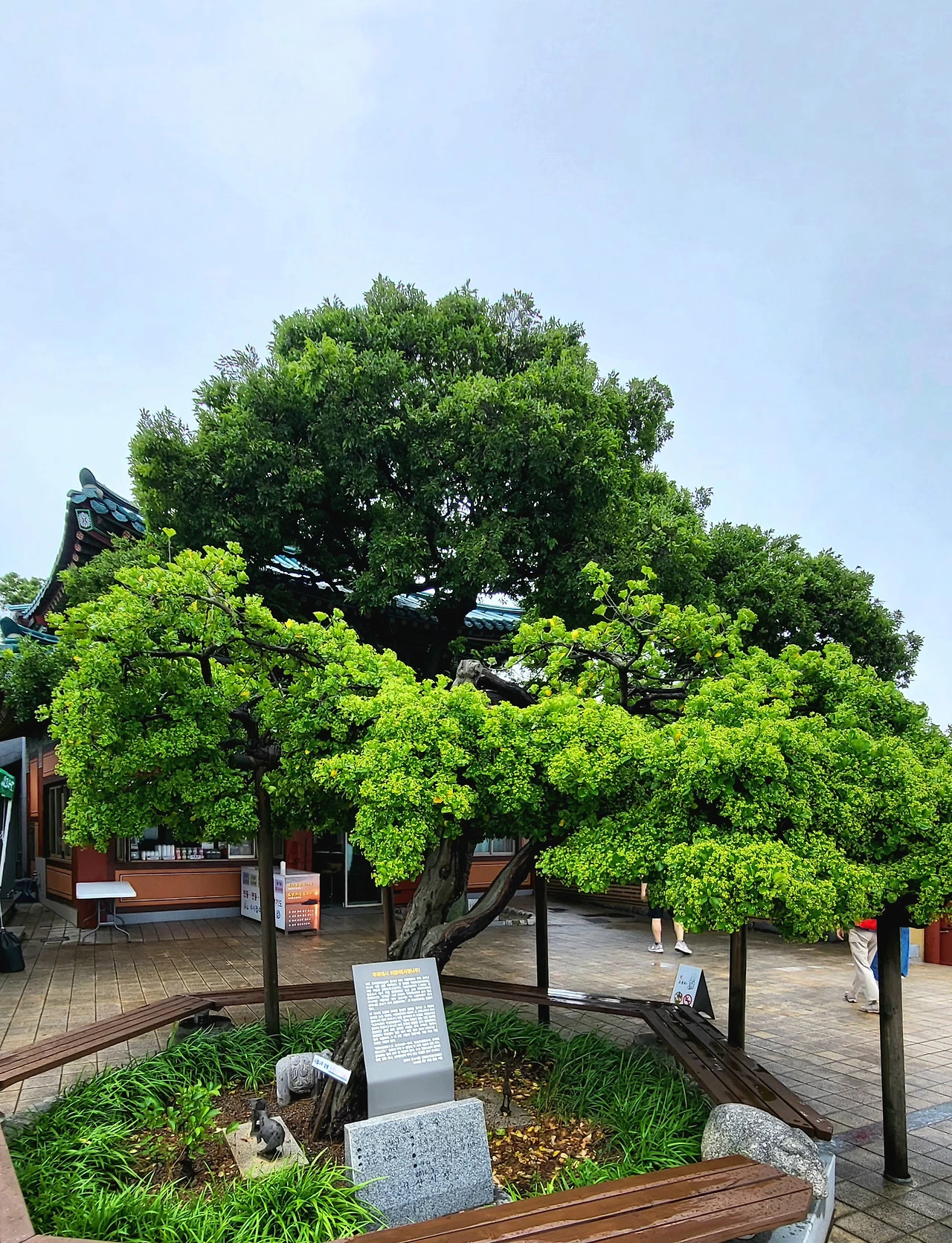특히 간월암 사찰 앞마당 설명문의 무학대사 지팡이 사철나무 이야기는 간월암의 영험함을 보여주는 상징이다. 1300년 전 원효대사가 창건하시고 조선 초 무학국사께서 중창 후 간월암이라 암자 이름을 명명한 후 대사가 간월암을 떠나면서 "이 나뭇가지가 다시 살아나면 불교가 다시 흥하리라"라고 예언하며 손수 짚고 다니던 지팡이를 꽂아 놓았는데, 1930년대에 이르러 그 고목나무가 기적적으로 다시 살아나 잎이 피어났다고 한다. 이를 직접 확인한 만공 선사가 "범소유상(凡所有相)이니 불면윤회(不免輪廻)로다. 즉 일체 모양이 있는 것은 윤회를 면하지 못한다"라고 하시고 충창을 결의 1941년 간월암 중창 완공했다. 또한 1942년부터 3년간 조선의 독립을 위해 천일기도를 올린 후 사흘 만에 광복을 맞이했다는 이야기는 인근 만해 한용운 선생의 역할과 더불어 단순한 전설을 넘어선 역사적 감동을 준다. 그러한 유서 깊은 사철나무의 새순 끝잎의 영롱한 빗방울에 반사된 법당 안의 부처님이 연신 핸드폰 카메라 눈에 들어온다.