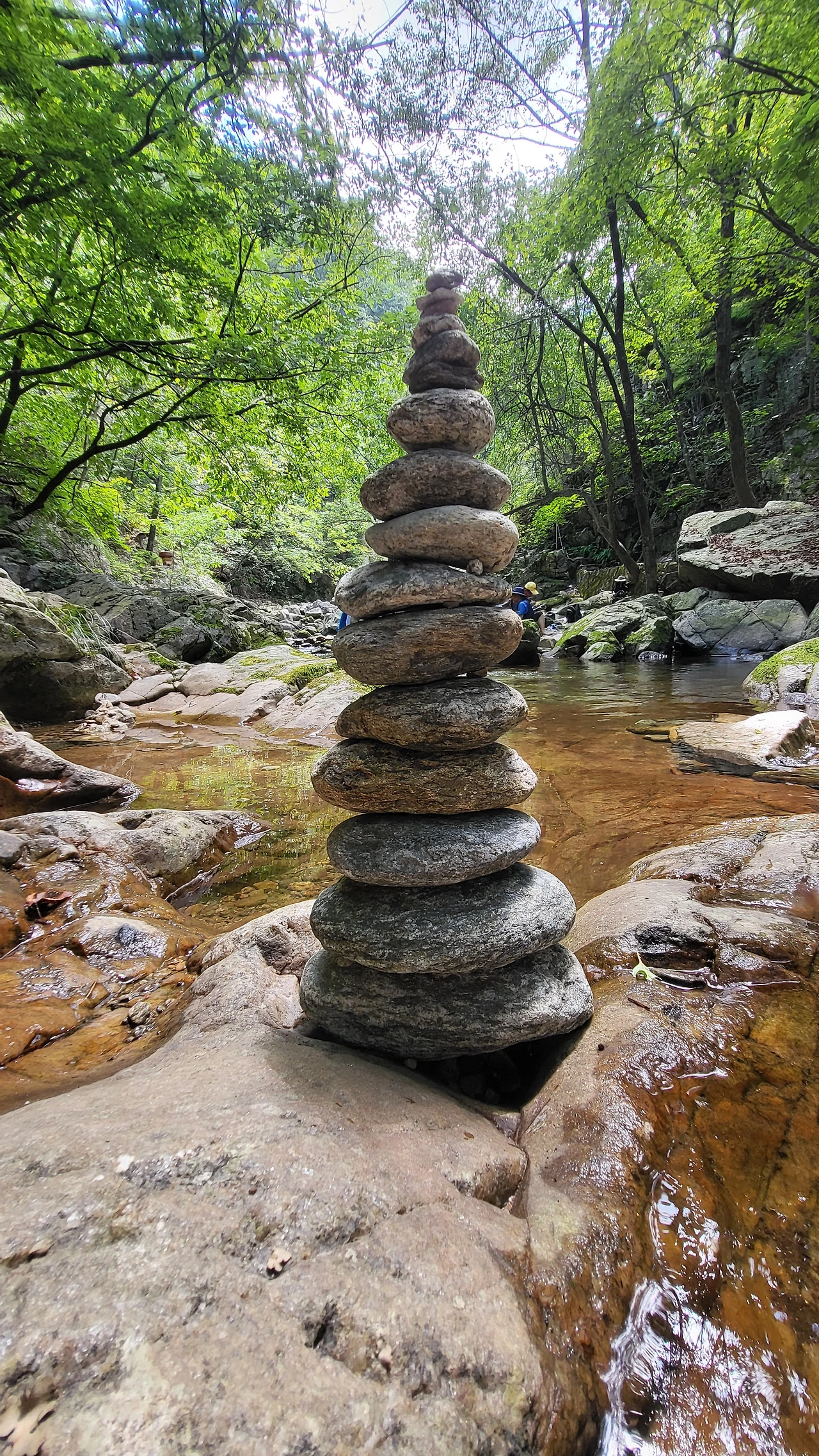 을사년 여름, 유명산 계곡의 오랫동안 기억에 남을 천렵(川獵), 계곡물속의 송사리 사냥 대신 참치캔을 보양식으로 제공한 것은 보시 중의 최고의 보시가 되지 않았을까. 어찌 보면 송사리 집에 와서 발 담그고 막걸리 나누는 시간을 제공했으니 당연한 사용료 아닌가. 물결 너머 9층 돌탑은 '당연한 사용료 잘 나누어주었다' 미소를 짓는다.