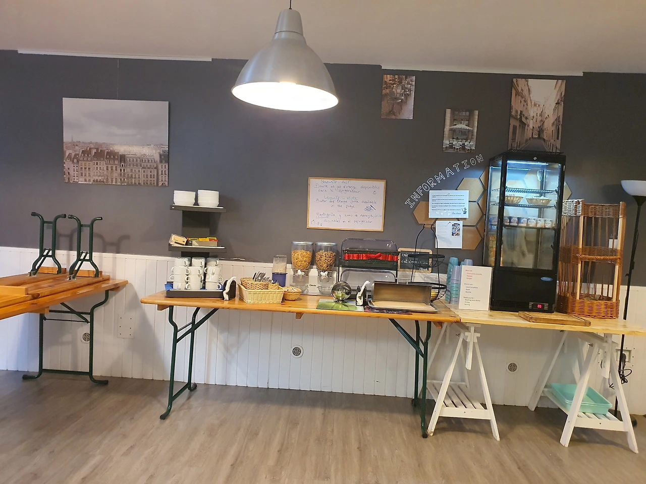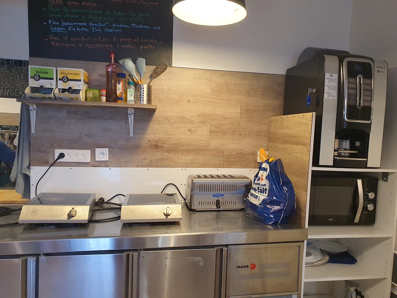 신기한 알베르게를 이곳저곳 둘러보았다. 화장실도 확인하고 샤워부스도 가 보았다. 문짝 하나 크기 면적의 화장실 4개와 그 정도보다 약간 큰 공간의 샤워부스가 이층에 설치되어 있었다. 일 층은 여행객들을 맞이하는 로비와 식당이 있었다. 친절하게 이 알베르게는 간단한 식기 도구들도 준비해 놓았다.
