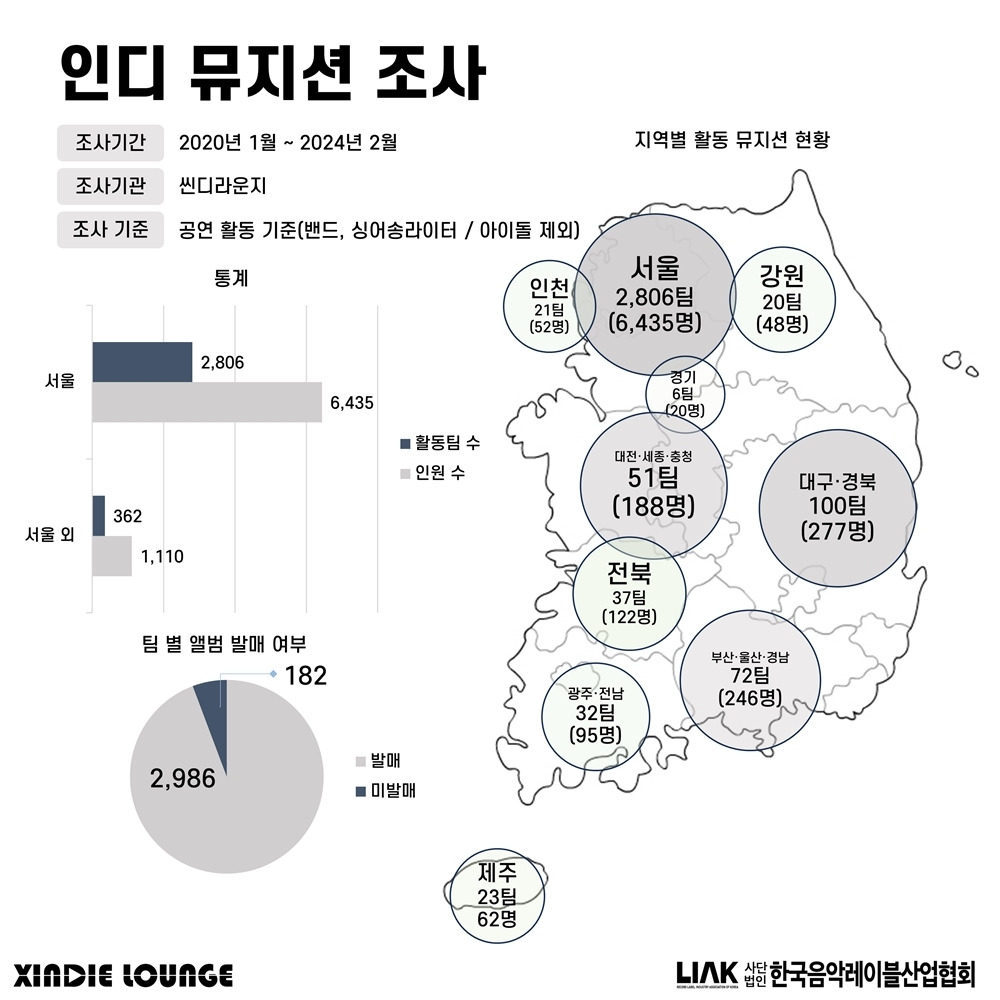 문화체육관광부 의뢰로 한국음악레이블산업협회가 제출한 자료에 따르면 2024년 2월 기준 한국 인디뮤지션(밴드와 싱어송라이터)의 수는 총 2,806팀, 7,545명에 이른다. 2023년 말 기준 한국음악저작권협회 등록 회원 수 51,000여 명의 14%에 이르며, 음악가를 분류하는 카테고리 중 가장 큰 비중을 차지할 것이다.