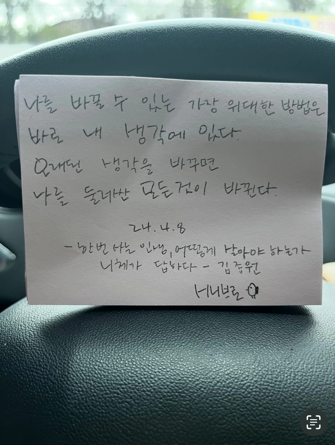 좋은 글을 따라서 쓰니 작은 보물을 하나씩 얻는 기분이 들었다. 첫날은 운전하다 소식을 전해 듣고 주차 후 적어 올렸다. 가진 게 포스트잇이라 핑크포스트잇에 적어준 글을 한 글자씩 적었다.