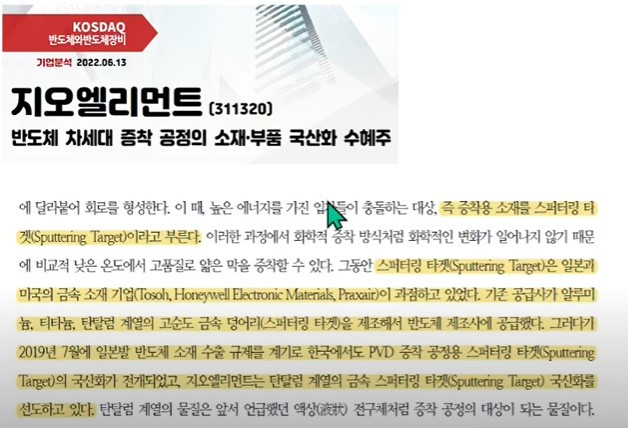 EUV 관련 ALD(원자층 기상 증착) 소재 관련 기업으로 알려졌으나 최근 에스앤에스텍의 EUV용 블랭크 마스크에 필요한 흡수체(탈탄늄계)와 위상 반전(접하는 EUV 광원을 상쇄시키는) 기술을 위한(정교한 EUV용 블랭크---> 포토마스크) PVD(물리적 기상 증착방식) 스퍼터링 타깃용 소재 국산화를 위해 노력 중입니다. 흡수체와 위상반전 막에는 탈탄늄계 소재가 쓰이는데 현재는 미국과 일본 소재 기업에서 전량 수입 중으로 막대한 료열티를 지급하고 있습니다. 현재 국산화를 위해 지오 엘리먼트에서 연구 개발 중입니다. 최근 지속적으로 상승하였으나, 지속적으로 모아갈 계획입니다.