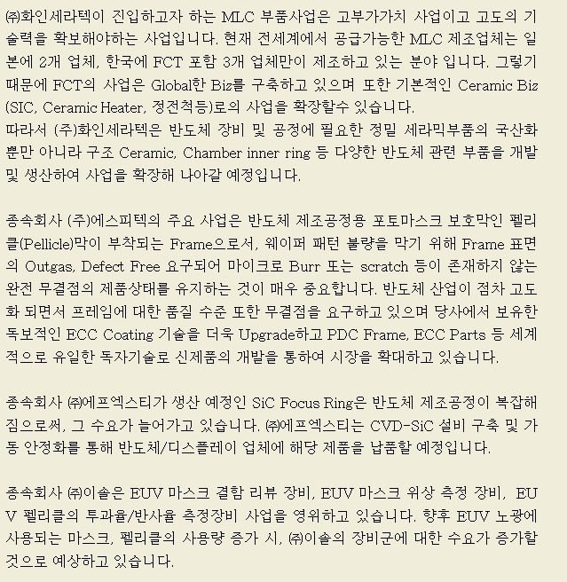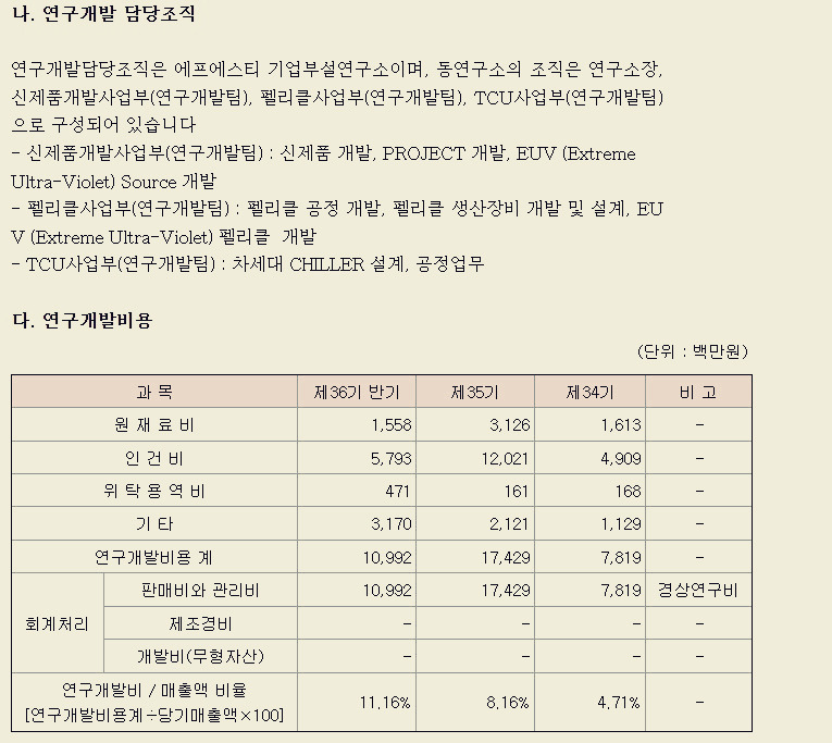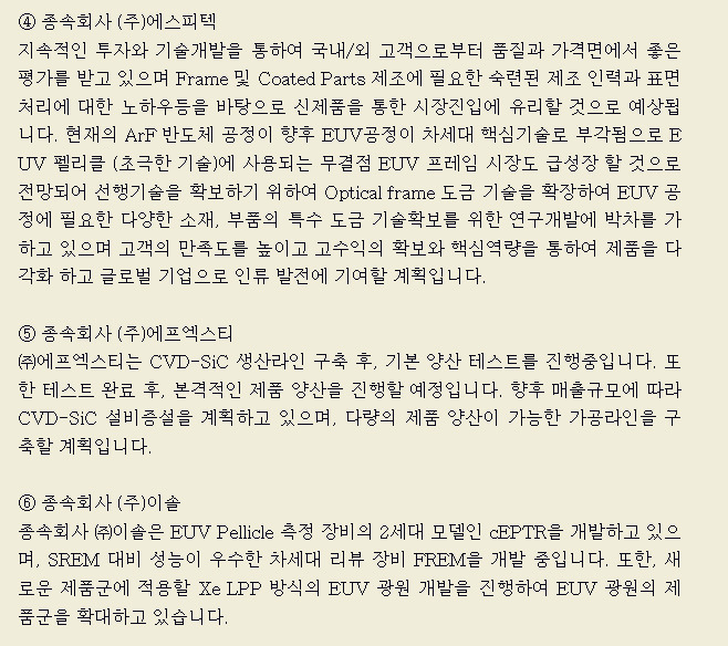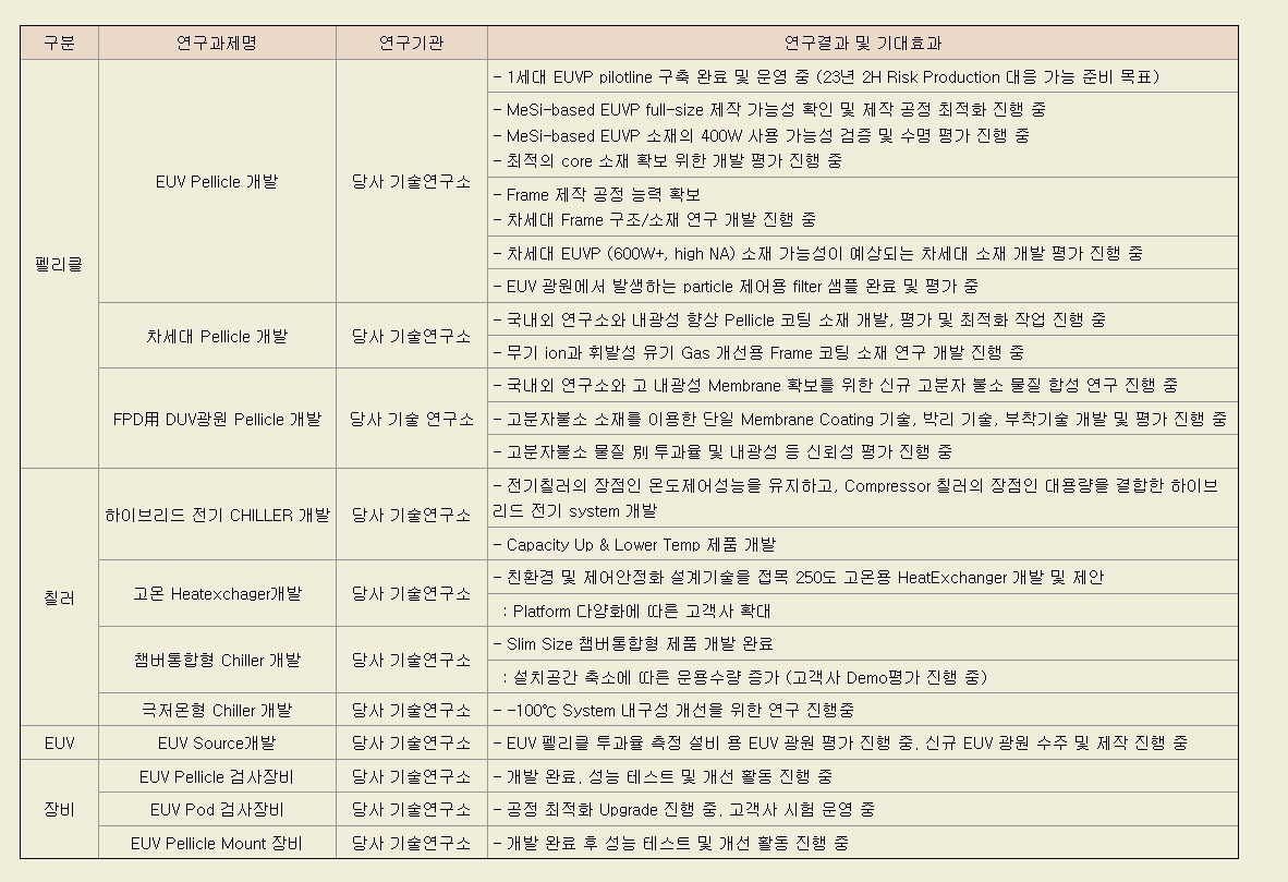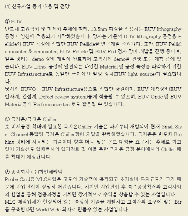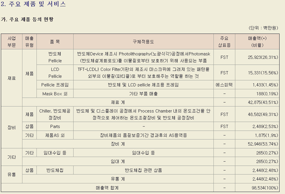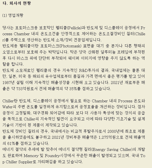 영위하는 사업으로는 펠리클 관련 비중이 43.51%, 칠러 장비(챔버 내 온도를 제어하는) 53.74%를 주로 하는 기업입니다.