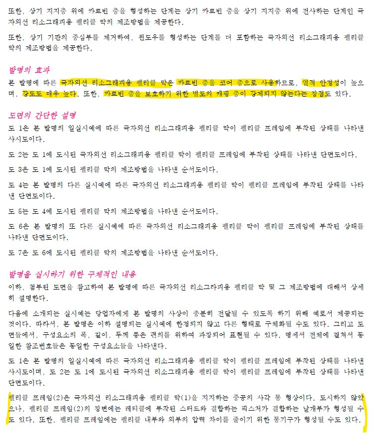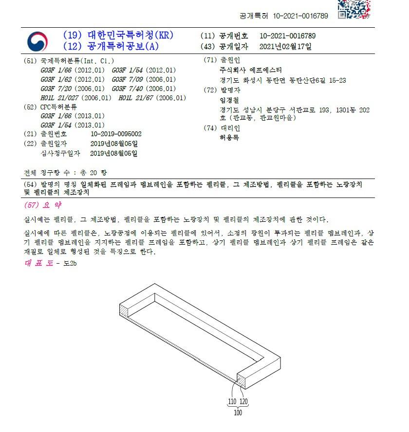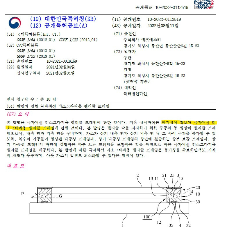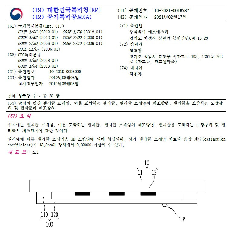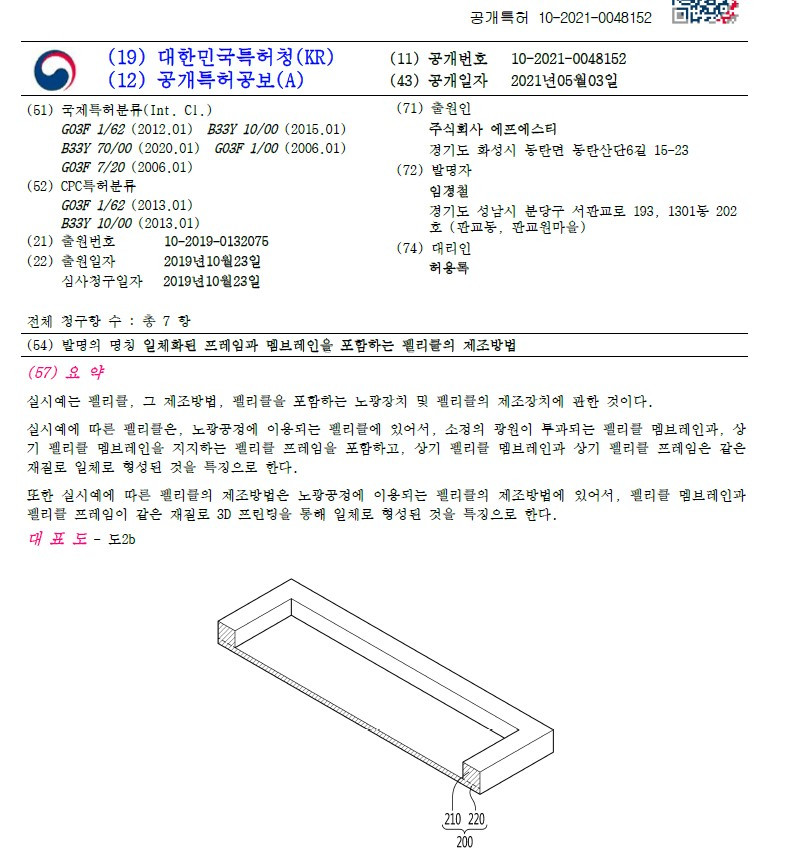 3D 프린트를 이용한 특허입니다. 위의 Out gasing과 열팽창 계수에 의한 뒤틀림을 해결하기 위하여 열팽창 계수가 비슷한 재질로, 접착하지 않고 3D 프린팅 기술을 이용하여 EUV펠리클 박막, 멤브레인, 프레임을 일체형으로 만들겠다는 것입니다.