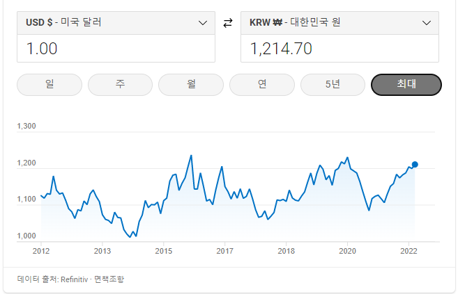 98년은 대한민국의 "IMF"로 08년은 미국의 "리먼 브라더스"사태 2014년은 미국 연준(FED)의 "테이퍼링"시기, 2020년 코로나를 제외하면 대부분 1,100원대에서 1,200원 초반대의 박스권을 유지한다