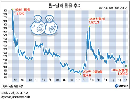 좌 최근 10년간 달러 변동추이, 우 IMF(98')와 리먼브라더스(08')의 98~2014년의 환율 추이