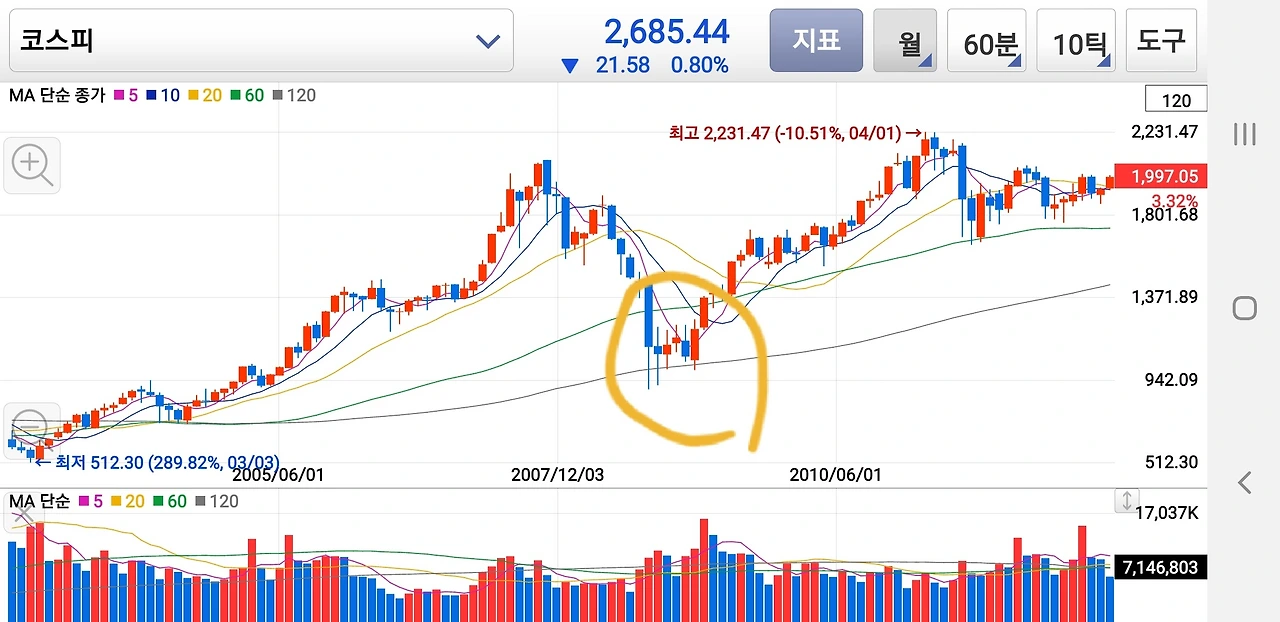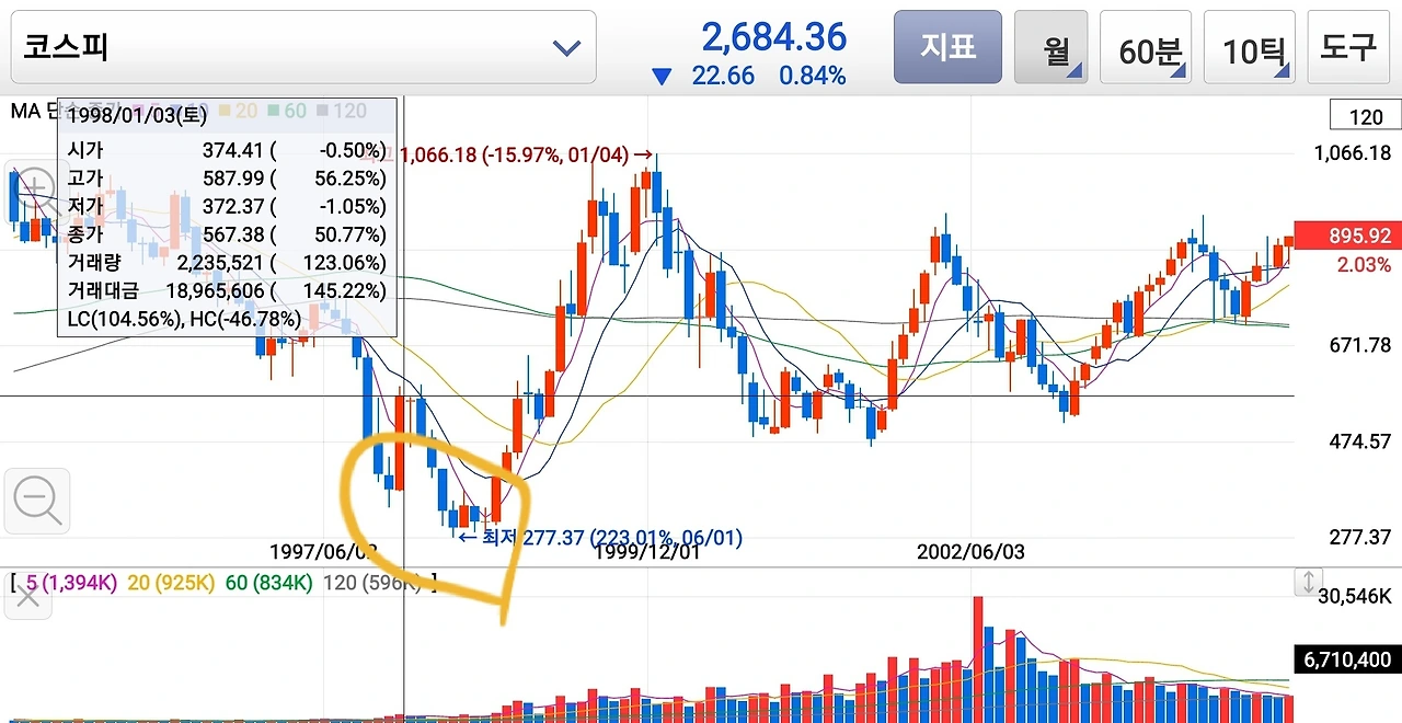 좌 IMF, 우 리먼브라더스 시기의 주가 변동추이