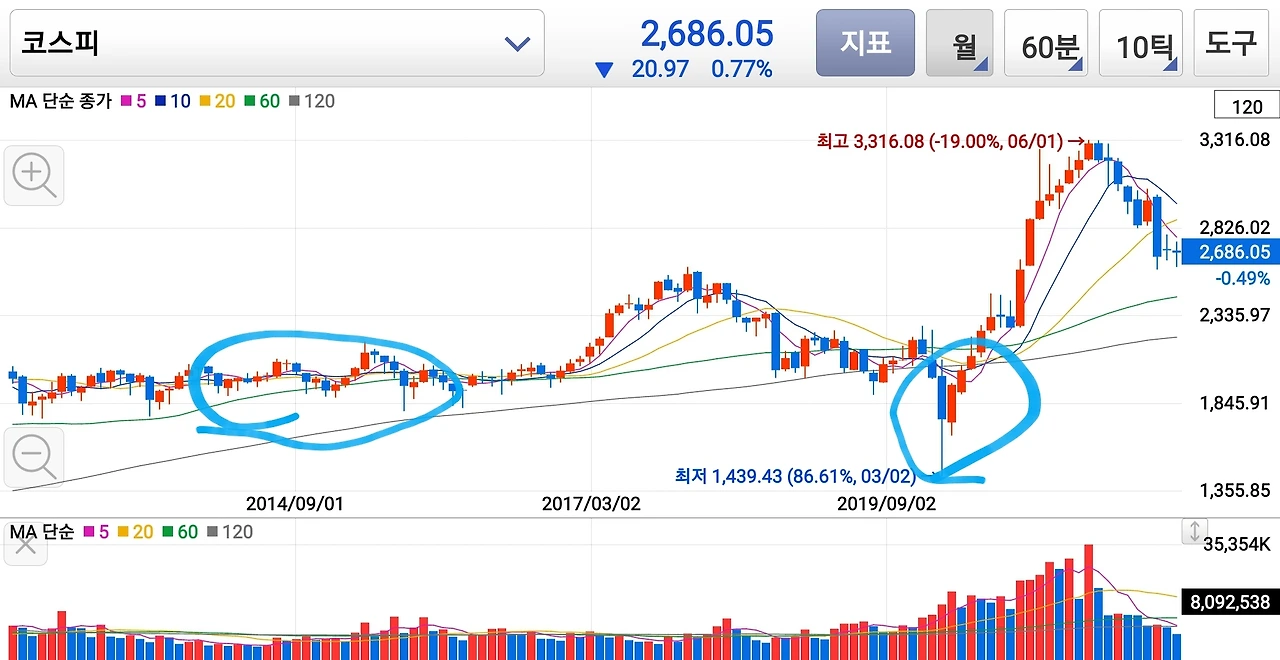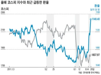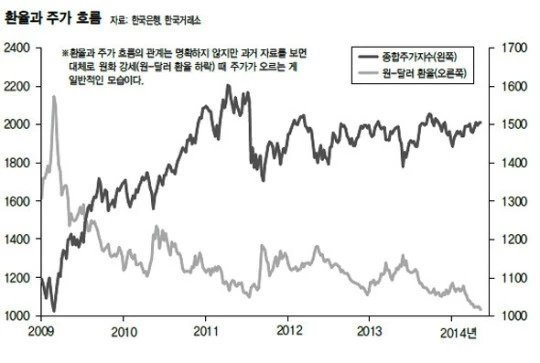 한 가지 이상한 것은 2014년 FED의 테이퍼링(금리인상) 시기에 주가와 환율이 변동성이 일반적인 흐름과 다르다는 것이다 주가는 횡보 달러는 폭등을 하였다 이는 미국의 금리인상의 보폭에 늦게 대응한 한은(한국은행)의 실수라 생각된다
