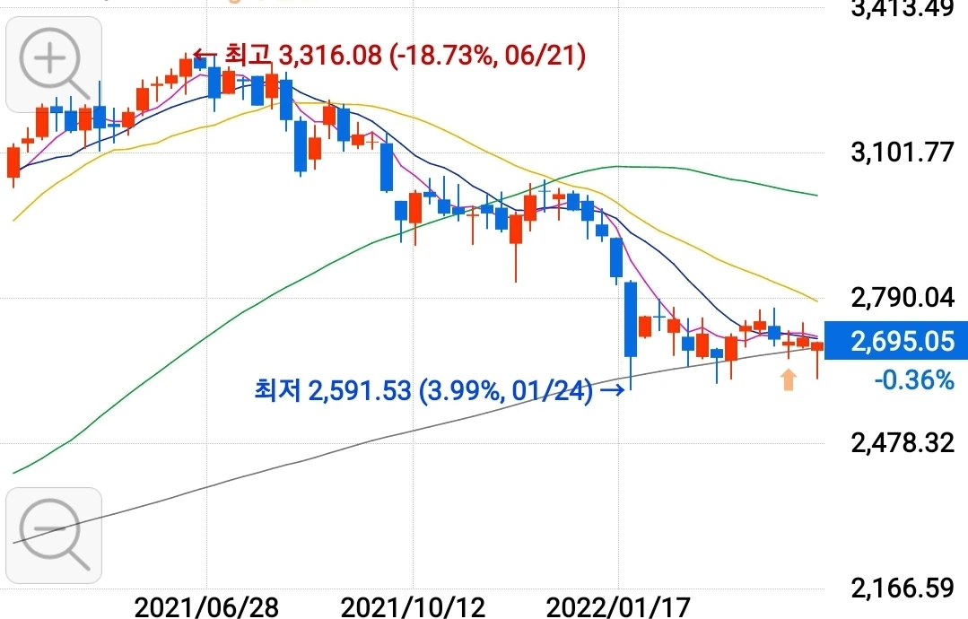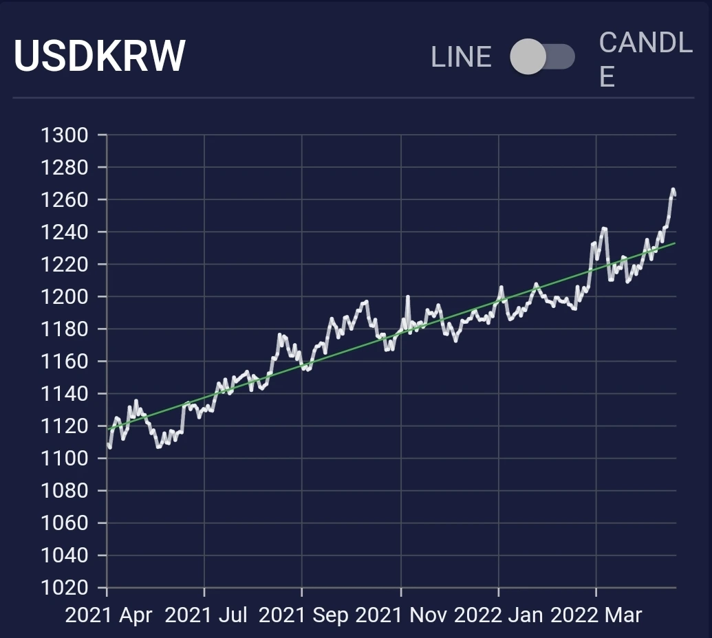 외국인 투자자 또한 금리 인상과 긴축의 불확실성에 대한 두려움에 러우 전쟁, 중국의 봉쇄 등의 악재가 더해져서 위험자산인 증시에서 빠르게 발을 빼고 안전자산인 달러나 국채 등으로 발을 옮겼다 그래서 국내 증시는 고점 대비 22% 정도 폭락했고 변동성이 낮은 달러/원 환율은 13% 정도 폭등했다
