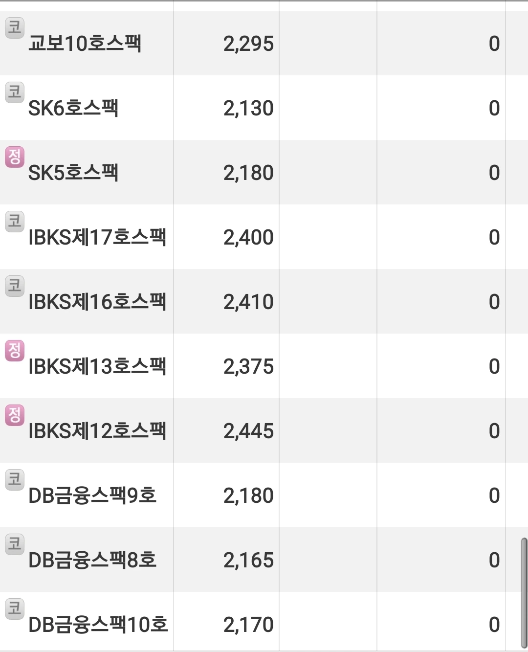 일반적으로 증권사의 이름과 번호가 합쳐져서 표기되며 공모가는 2,000원으로 고정되어있으며 규모는 주식수로 결정된다