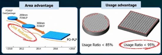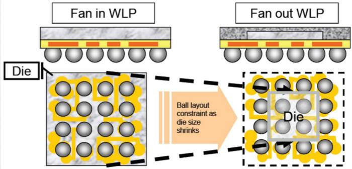 FO(Fan-Out))라는 것은, 다이 사이즈보다 큰 면적에 볼(ball)이 있는 구조로, 이때 볼은 칩(Die)과 기판을 전기적인 기능을 할 수 있도록 연결해주는 역할을 합니다. 반대로, FI는 Fan-In의 약자로 칩(Die) 면적 안에 볼(ball)이 있는 모양입니다. 현재, 다이(칩)의 크기가 줄어들고 있는 상활에서 FI에서의 볼은, 칩의 크기에 맞추어 같이 작아져야 합니다. 일괄적인 볼의 레이아웃(Layout, 배치) 이 어렵다는 단점이 있습니다. 또한, FO는 FI에 비해 하나의 다이(칩) 당 볼의 수가 많아, 패턴의 효율성을 높일 수 있습니다.