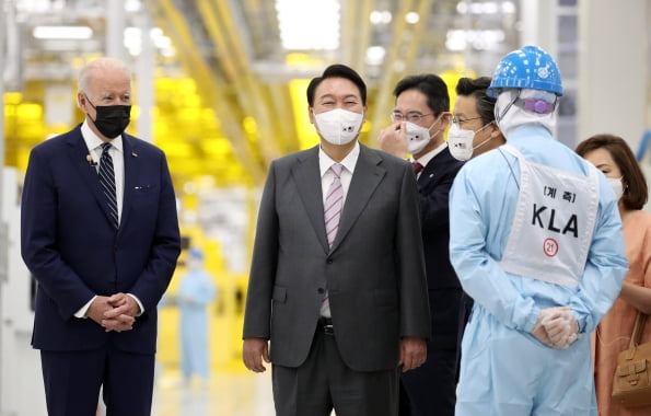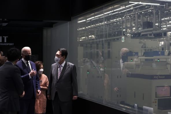 조 바이든 미 대통령이 윤석열 대통령과 삼성전자 반도체 공장을 시찰하고 있다.