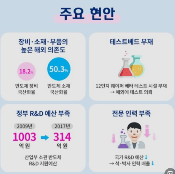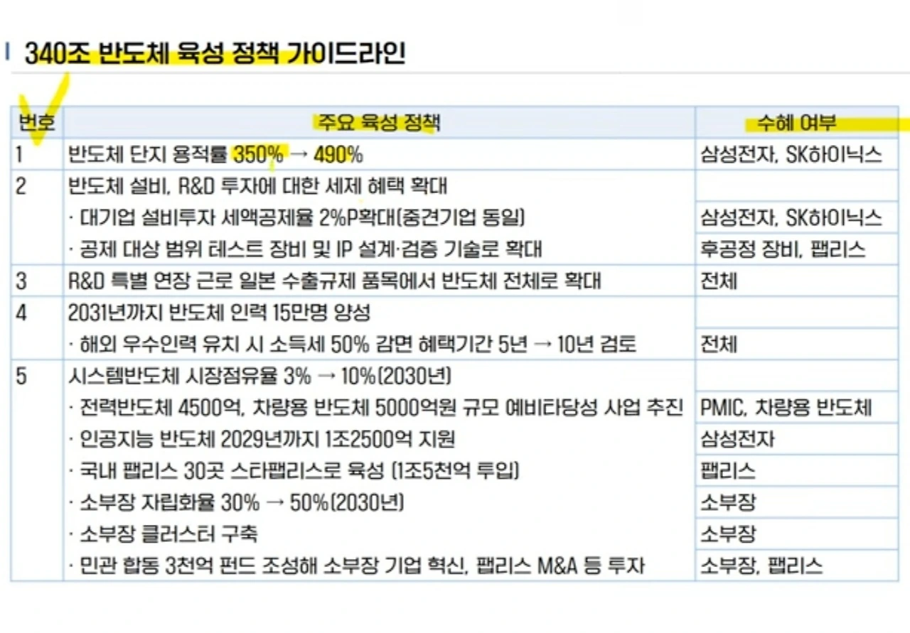개인적인 의견으로는, 전체적으로 그동안 삼성전자와 SK하이닉스에 집중됐던 지원을, 소부장(소재, 부품, 장비)및 산업 전반에 확대하여, 반도체 초강국으로 우뚝 서겠다는 정부의 의지라고 생각 들어 기대가 큽니다.