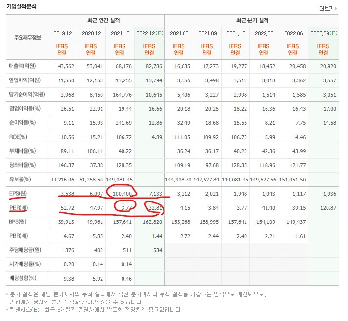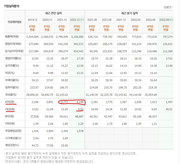삼성전자 22년 8.30 기준 재무현황EPS상승분은 (6,148-3,166)/3=994가 되고 이를 상승률로 계산하면, ( 994/6,148)*100=16.16%
