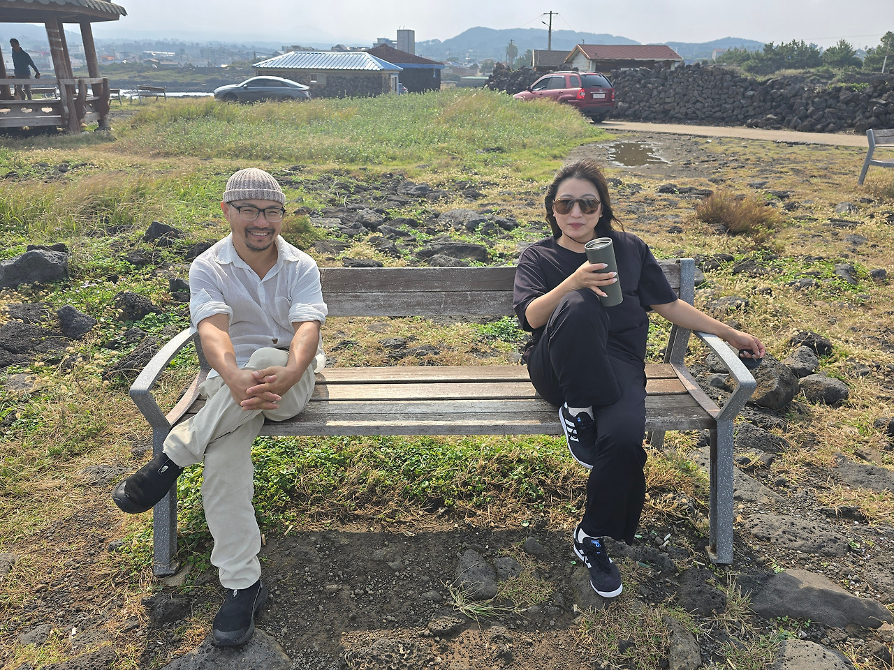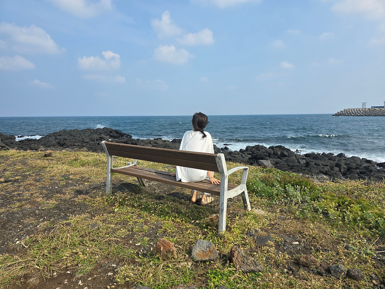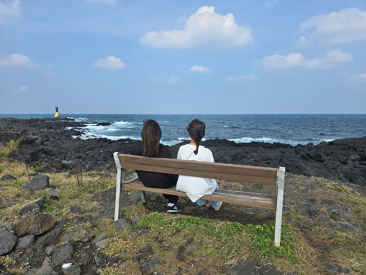 애월해안길 초입에 있는 그야말로 바다 감상용 벤치에 앉은 아벨과 승민씨의 백과 흑의 의복이, 안경이, 자유롭게 올린 한쪽 다리의 선이, 모든 것이 조화롭다. 자연을 배경으로 우리 셋은 자연보다 튀지 않고 자연스럽게 융화된다. 그래서 좋다.