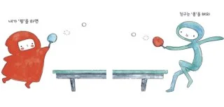 그래서 첫 번째 책을 <핑!>으로 정했지요. 소통의 다양한 관점들이 재미있게 표현된 그림책이기 때문입니다. 이 책에서는 핑과 퐁 두 친구가 나옵니다. 딱 느낌이 오시지요? 빨간 탁구채처럼 생긴 핑이 들고 있는 파란 탁구채. 탁구공을 치는 소리를 흉내 낸 말이 이름이 된 핑퐁. 'Two to tango'라는 영어 표현이 있습니다. 직역하면 탱고를 추려면 두 사람이 필요하다는 뜻으로 우리말로는 보통 '손뼉도 마주쳐야 소리가 난다'는 의미로 사용하지요. 소통도 마찬가지입니다. 두 사람이 리듬을 탄 탱고를 출지 엇박자로 출지는 소통이 관건입니다. 탁구를 칠 때도 마찬가지죠. 핑이 공을 치면 퐁이 받아쳐야 합니다. 대신 이번 탁구는 시합이 아닙니다. 탱고처럼 상대방의 몸짓을 읽고 교감하며 최대한 안전하게 치고받는 패턴을 유지해야 하죠. 나는 누구라도 받아칠 수 있는 안전한 질문을 하고 참여자들은 안전하게 이야기합니다. 그런 면에서 제목을 'Two to ping pong'으로 달리 지어볼 수도 있겠네요. 여러 사람 앞에서 자신의 삶을 오픈해서 얘기하는 건 쉬운 일이 아닐 겁니다. 남들이 어떻게 생각할지에 대한 자기 검열이 있을 테니까요. 그래서 이 책을 선택했습니다.