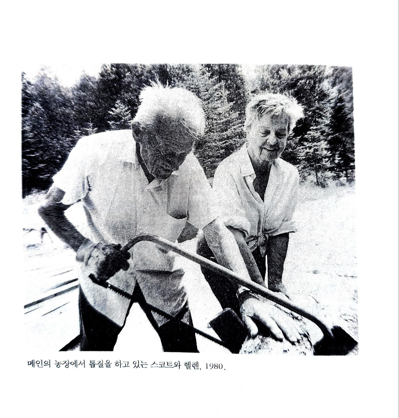스코트 니어링은 1883년 미국 소수 권력층 집안에서 태어나 엘리트 코스를 밟고 1915년 사회학 교수가 되었다. 그는 기득권에 그대로 편입될 수도 있었으나 할아버지가 운영하던 탄광에서의 일을 해본 경험을 통해 노동자들의 삶을 감각할 수 있었고 훗날 사회당과 노동당 당원이 되어 자본주의의 착취구조에 맞선다. 스코트는 1983년 100세로 죽기 직전까지 일을 했고 죽음의 때를 감지하였을 때 스스로 곡기를 끊어 삶을 마감한다. 그는 말했다.
