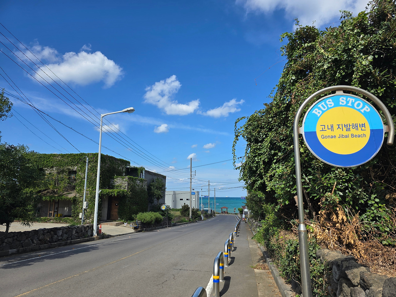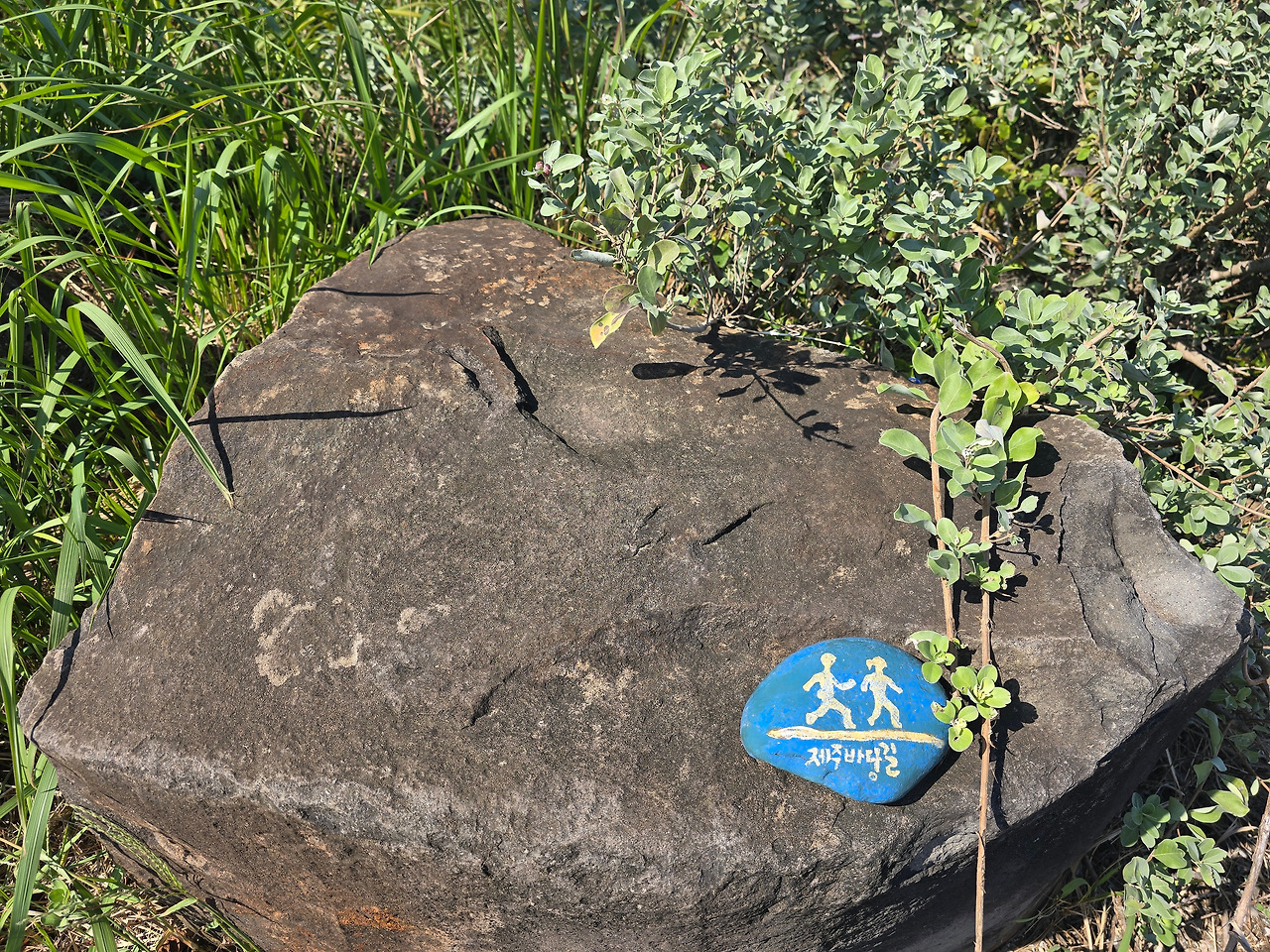주인에게 부탁해서 가게 앞에서 사진 한 장을 찍었다. 이 아름다운 배경의 일부분이 되고 싶은 욕심이 났으므로. 이 가게는 훗날 집으로 돌아가기 하루 전, 친구들과 함께 다시 찾았다. 그때 더 이야기하도록 하겠다. 가게를 지나 해안길로 나왔고 지도앱을 켜니 왼쪽으로 2킬로미터를 쭉 걸으면 내 숙소였다. 애월해안길을 쭉 따라 걸으면서 정자에 앉아 한참 파도를 바라보았다. 얼마 전에 쓴 <파란 접시>라는 시를 연상하며 애틋한 마음을 갖기도 했다. 그 시는 브런치스토리에 처음 올린 시이다. 집으로 돌아오는 길 옆에 커다란 바위 위에 해파랑길이라는 작은 돌멩이 이정표를 만났다. 큰 바위 위에 누워있는 작고 납작한 돌멩이어서 차로 지나가면 절대로 볼 수 없었을 것이다.