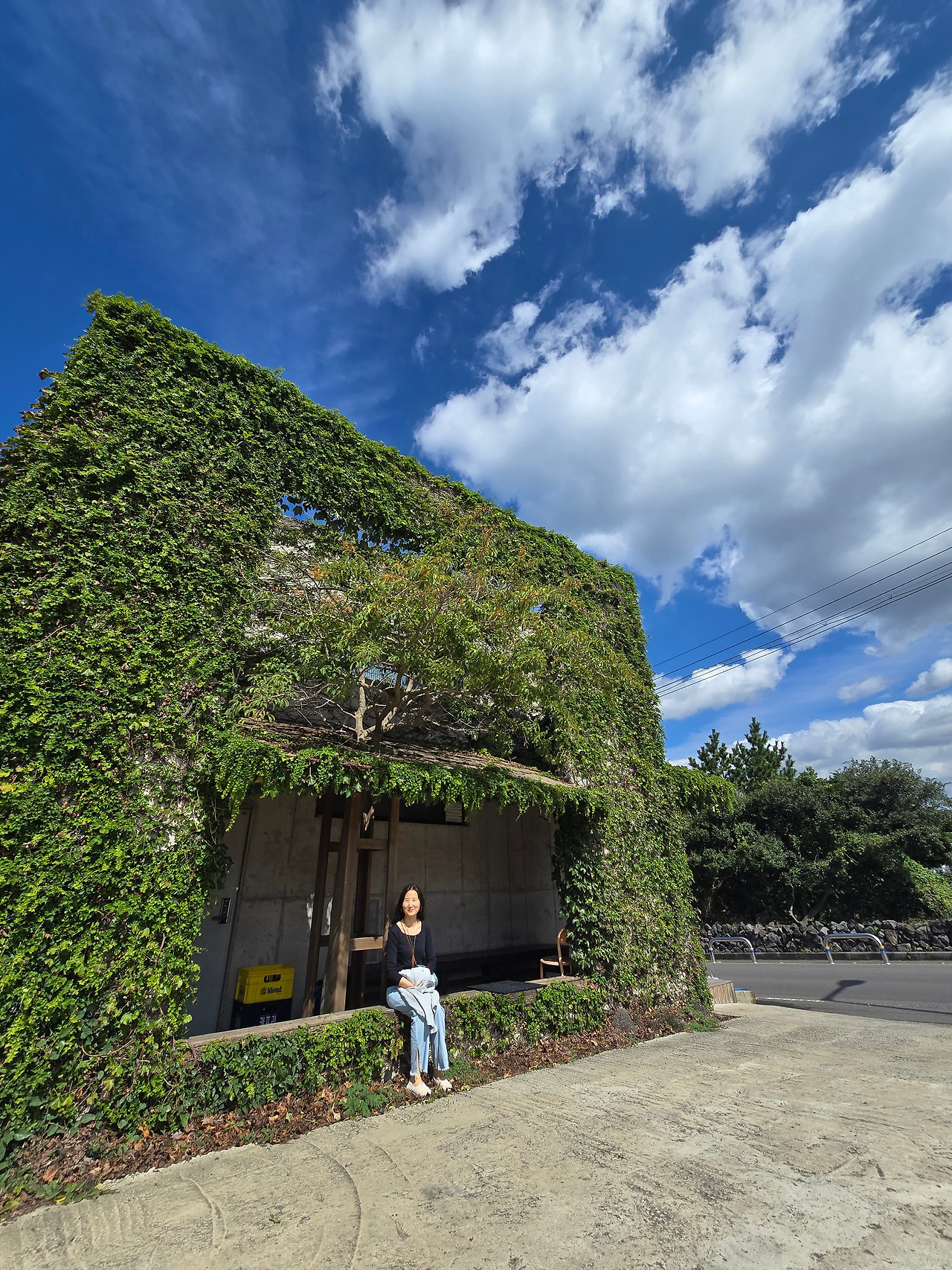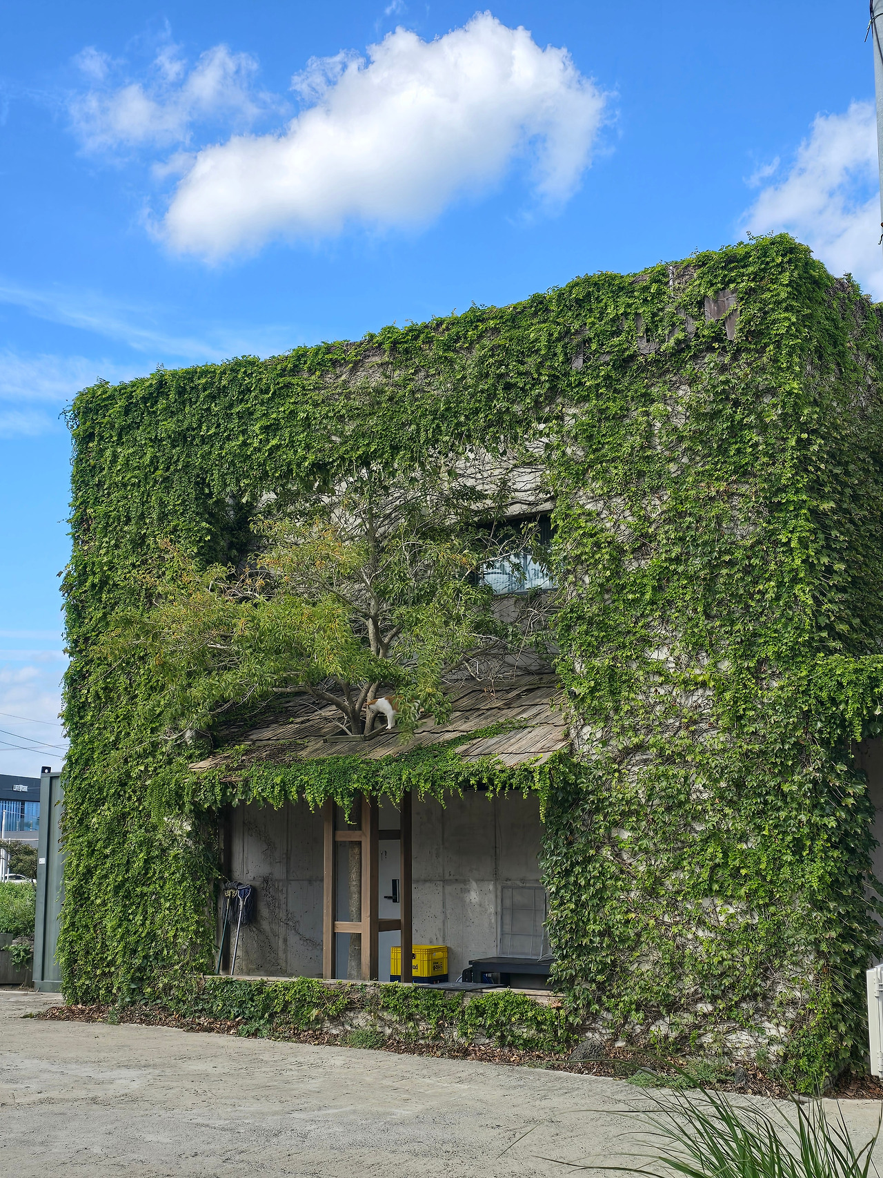 그 순간 왼편으로 보이는 이름 모를 아름다운 2층 건물이 내 시선을 완전히 사로잡았다. 마치 미야자키 하야오의 애니메이션에 등장할 만한 공간이었다. 벽면을 뒤덮고 있는 담쟁이 사이로 넓은 창처럼 열려있는 1층 공간에 나무 한 그루가 지붕을 뚫고 위로 솟아 나와 있었다. 멀리서 보면 건물을 뒤덮고 있는 초록이 나무인지 담쟁이인지 알 수가 없을 만큼 초록으로 무성했다. 처마처럼 덧대어진 1층 지붕을 견고하게 받치기 위해 나무 기둥을 세워두었는데 마치 캣타워처럼 보였다. 지붕 위에 노니는 노랑무늬 고양이 한 마리를 보니 다른 시공간으로 빨려 들어가는 기분이 들었다.