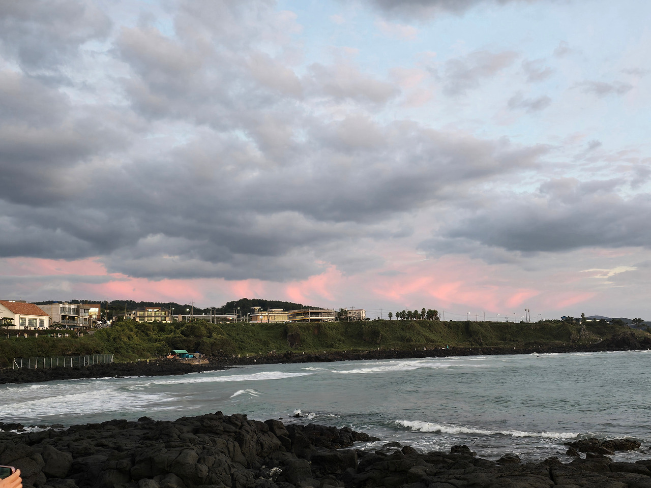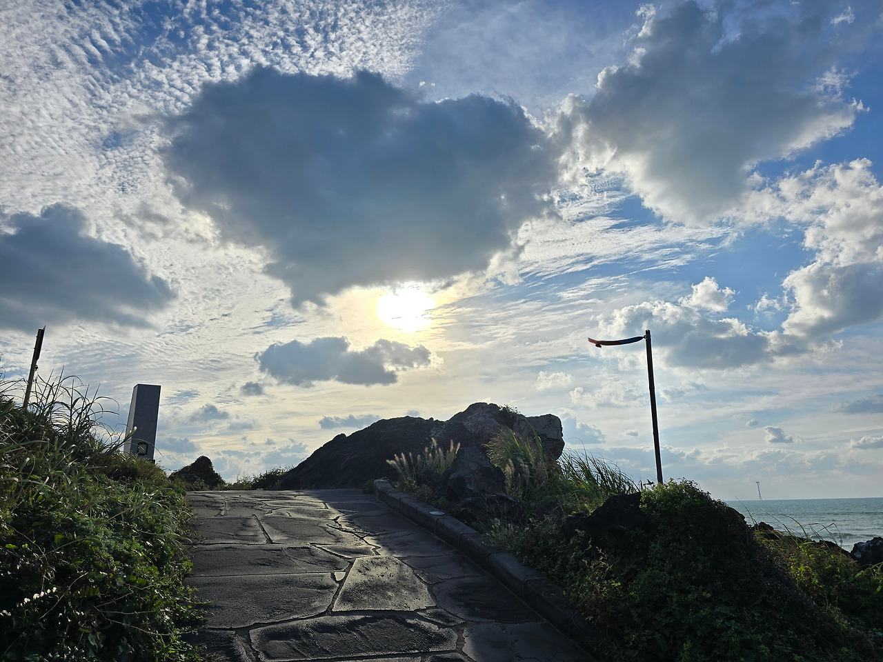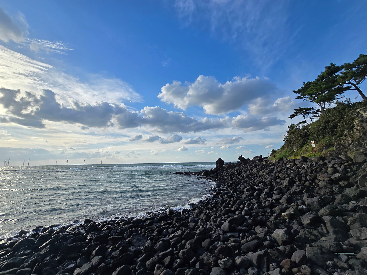 아직 해넘이를 보기에는 이른 시간이라서 해안 산책로를 따라 쭉 걷는다. 날씨는 여전히 좋다. 하늘 높이에는 목화솜을 속이 비치도록 얇게 펴놓은 것 같은 가벼운 구름이 홑이불처럼 펼쳐져 있고 그 아래에 목화솜을 뚝뚝 떼어 던져놓은 것처럼 묵직하게 내려앉은 구름들이 여러 층고를 이루고 있다. 산책로 아래에는 모래사장 대신 커다란 검은 돌덩이들이 길고 넓게 분포되어 있다. 제주도에는 돌이 참 어디에든 많다. 저 드넓은 바다 아래에도 끝도 없는 돌들이 있겠지. 그 돌들이 있어서 제주는 더 제주스럽지 않은가 생각해본다.