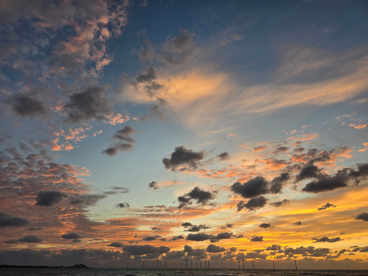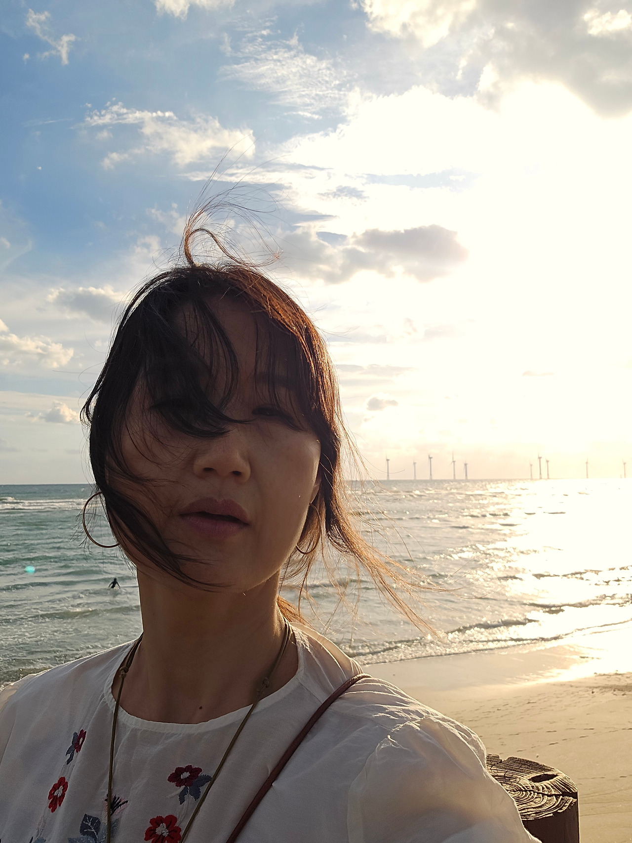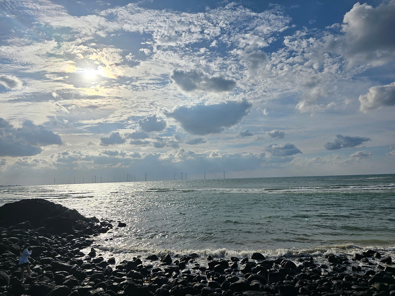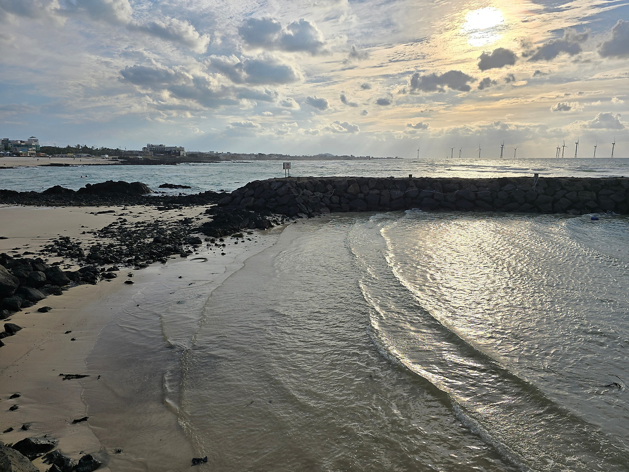 아직 해넘이를 보기에는 이른 시간이라서 해안 산책로를 따라 쭉 걷는다. 날씨는 여전히 좋다. 하늘 높이에는 목화솜을 속이 비치도록 얇게 펴놓은 것 같은 가벼운 구름이 홑이불처럼 펼쳐져 있고 그 아래에 목화솜을 뚝뚝 떼어 던져놓은 것처럼 묵직하게 내려앉은 구름들이 여러 층고를 이루고 있다. 산책로 아래에는 모래사장 대신 커다란 검은 돌덩이들이 길고 넓게 분포되어 있다. 제주도에는 돌이 참 어디에든 많다. 저 드넓은 바다 아래에도 끝도 없는 돌들이 있겠지. 그 돌들이 있어서 제주는 더 제주스럽지 않은가 생각해본다.