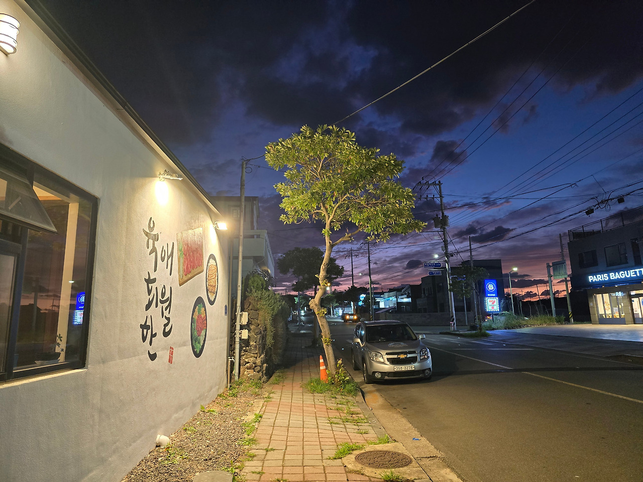 중간에 어두워져 애월읍 도로변으로 나왔다. 이제 저녁 먹을 시간, <육회한 애월> 앞