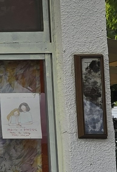 와우! 간판이 특이하다. 세상에 이런 종류의 간판은 처음 봤다. 흰 벽면에 걸어놓은 나무 액자 안에는 흰 광목에 검은 펜으로 그려진 5명의 남녀가 권태로운 표정을 짓고 있다. 긍정적으로 표현하자면 나른한 표정이 될 수도 있겠지만 나는 왠지 그들이 한없이 권태로워 보였다.