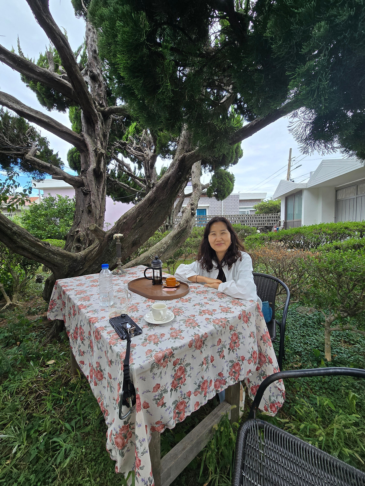 카운터 오른편에 난 작은 미닫이문을 열면 마당으로 연결된다. 잘 정돈된 마당에 두어 개의 테이블이 있고 그 옆에 화단처럼 흙을 성인 허리 높이쯤 돋아놓은 곳에 꽃무늬천을 씌운 테이블이 놓여있고 오랜 세월을 살아낸 나무 한 그루가 그늘을 만들어 주고 있다. 우리는 꽃무늬 천이 깔린 야외 테이블로 마음을 정하고 성큼 올라섰다. 풀밭이 다듬어지지 않은 채 우거져 있기까지 했지만 그 자연스러움이 오히려 좋았다. 주인냥이 주변을 맴돌며 테이블 위로 올라오기도 하는 게 좋았다. 이곳에서 나누는 여러 이야기들이 좋았다.