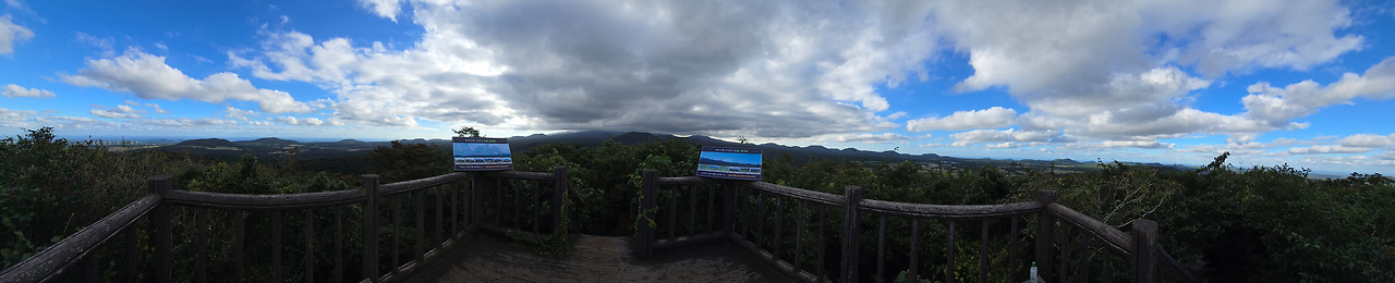 붉은오름 전망대는 가로세로 폭이 3미터가 채 되지 않을 것 같은 좁은 공간으로 등받이 없는 벤치 2개가 가로와 세로로 난간 옆에 하나씩 길게 놓여있다. 위 사진은 파노라마로 찍은 사진이어서 꼭 엿가락처럼 길게 늘여져 있어서 공간이 변형되어 보인다. 내가 전망대에 도착했을 때, 먼저 올라왔던 여자 2명이 내려갔다. 공간이 좁다 보니 나를 배려해 준 것 같다. 정상은 탁 트여있는지라 바람이 제법 세게 불었다. 나는 센 바람을 좋아한다. 특히 맞바람으로 맞는 바람이 좋다. 벤치에 올라서서 바람을 온몸으로 맞아보았다.