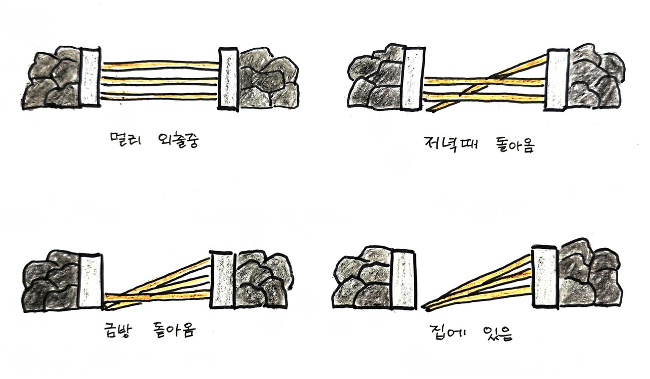 출입문 정주석에 빠져있던 정낭에 대해 다음에서 검색하여 알게 된 내용을 소개하려고 한다. 정주석에 3개의 구멍을 뚫고 기다란 나무막대인 정낭을 끼우는 것은 제주만의 특별한 풍습으로 고려 때부터 시행되었다고 한다. 소나 말의 출입을 막으면서 동시에 집주인이 집에 있는지 없는지 언제 돌아오는지까지 이웃에게 알리는 소통방식이다.