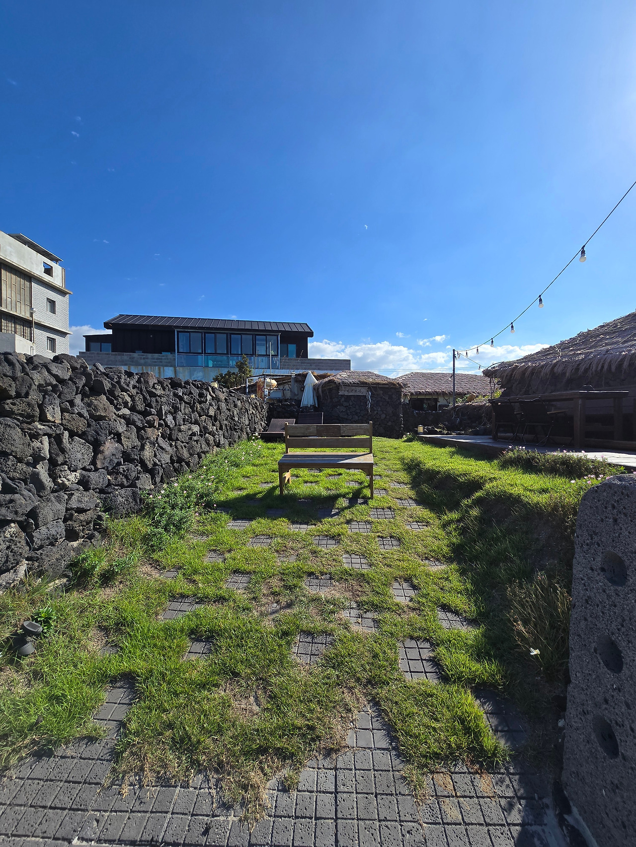 돌담 사이로 출입문이 보이고 언덕처럼 솟은 초록 잔디가 보인다. 저 집에는 어떤 이가 살고 있을까?