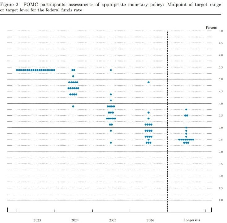 연준은 이날 기준금리를 예상대로 동결했다. 역대 최고 수준에서 3연속 동결이다. 그 동안은 긴축과 인상에 대한 언급만 있었다. 그러나 연준 성명서에도 "지난 한 해 동안 인플레이션이 완화되었다"라는 사실도 언급해 사실상 금리 인상이 종료되었음을 시사했다. 실제로 FOMC 참석자 19명 중 17명이 24년도 금리가 현재보다 낮아질 것으로 예상했다.