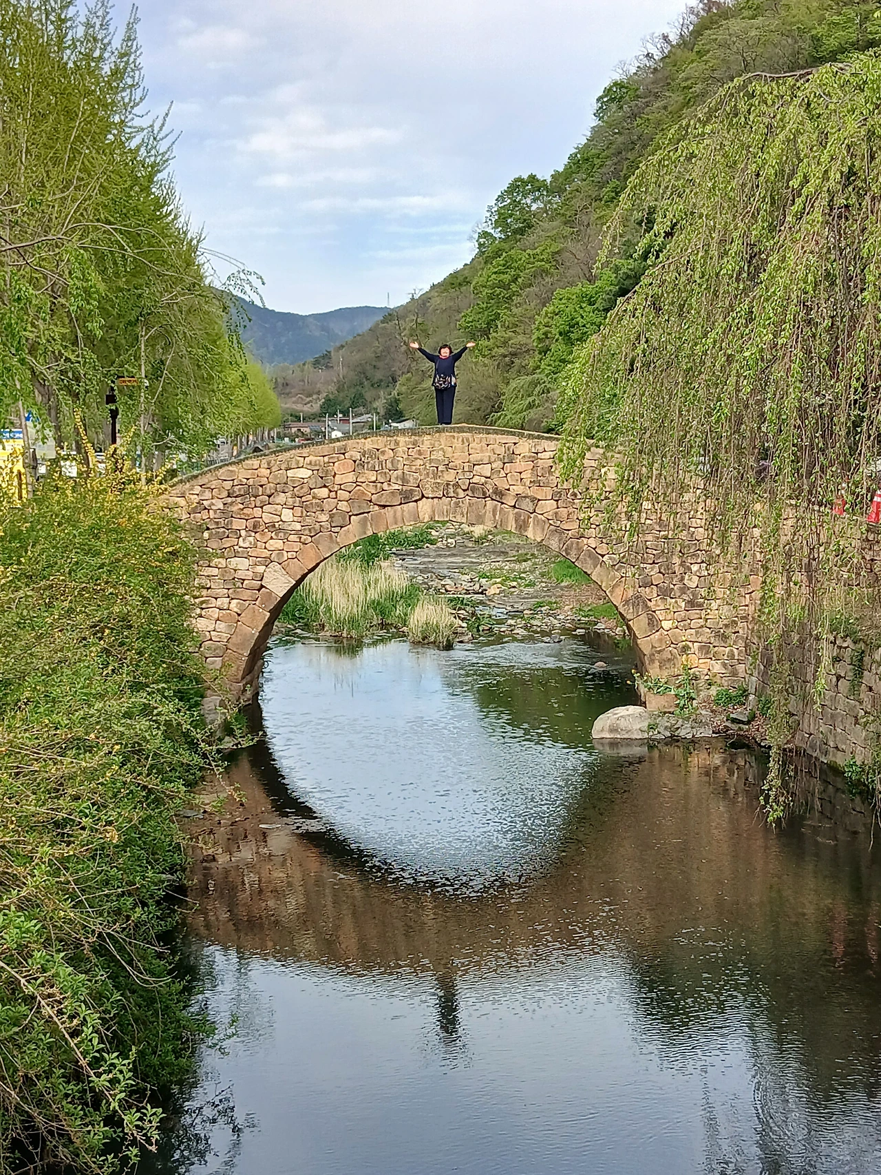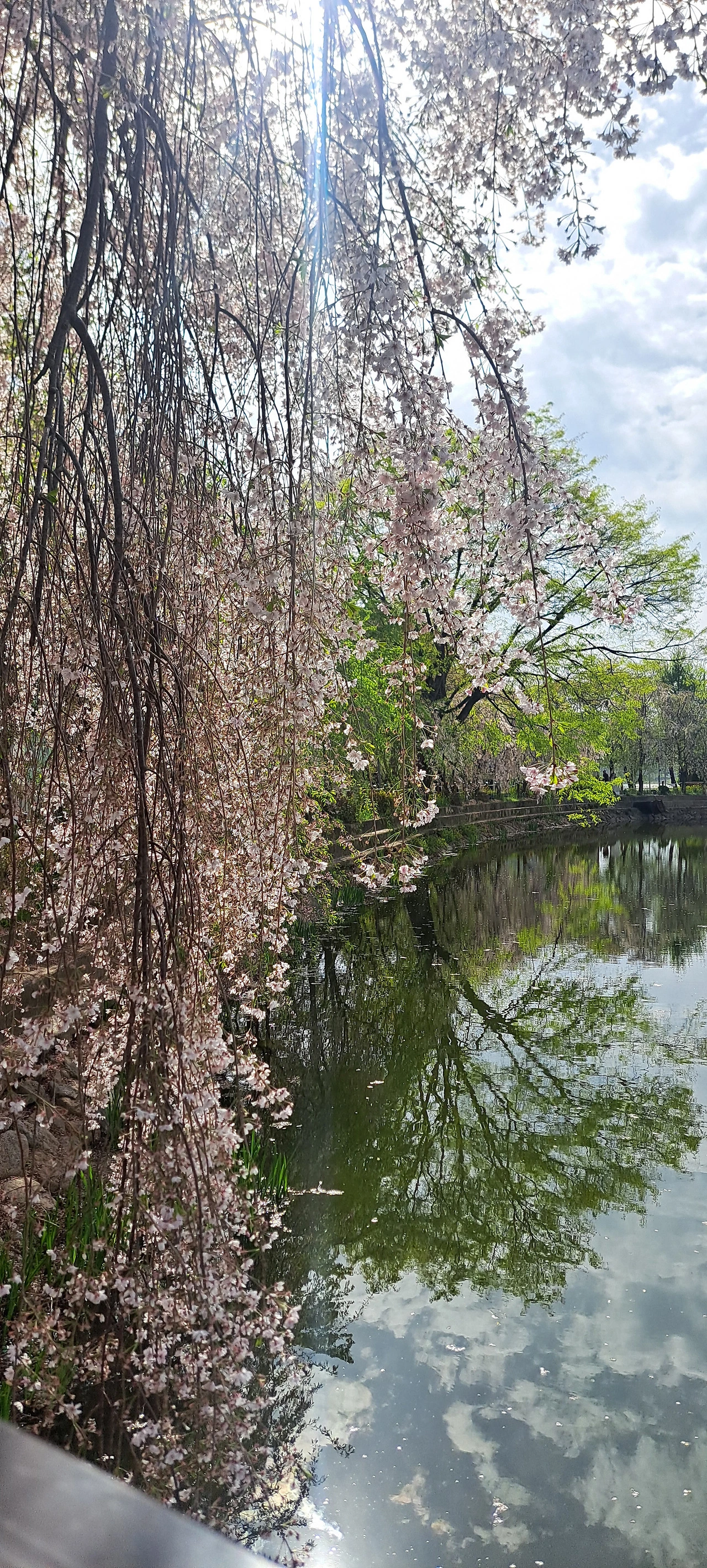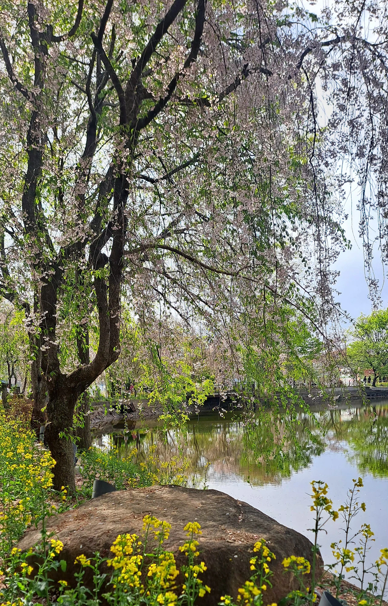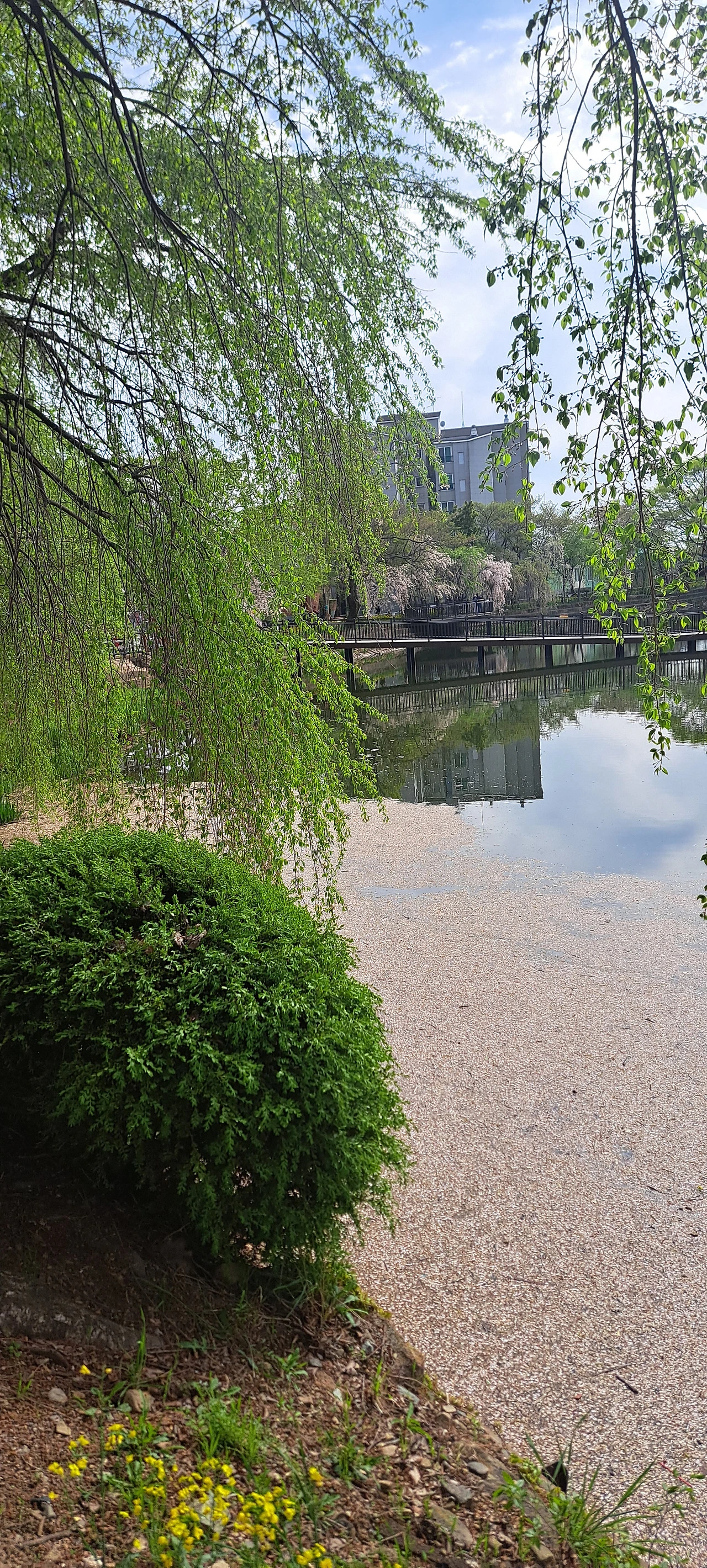 죄측에 노오란 개나리 우측에 연분홍 능수벚꽃이 고운 장소인데~~~어느새 연두빛 새 잎 신록의 계절이~(