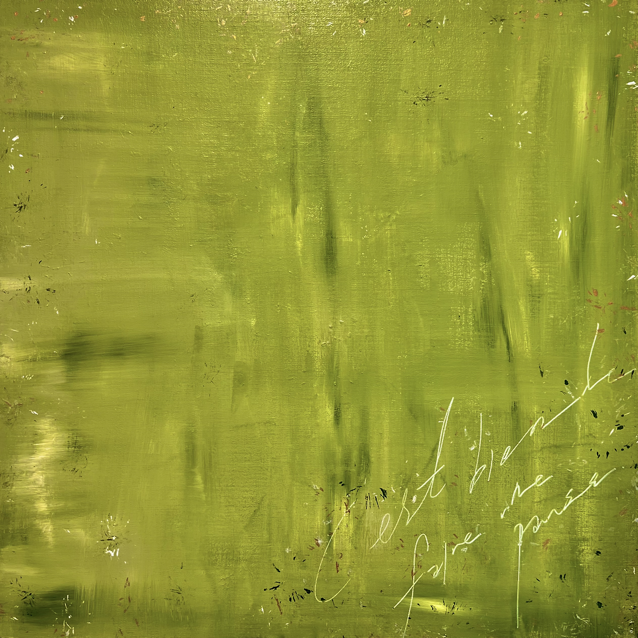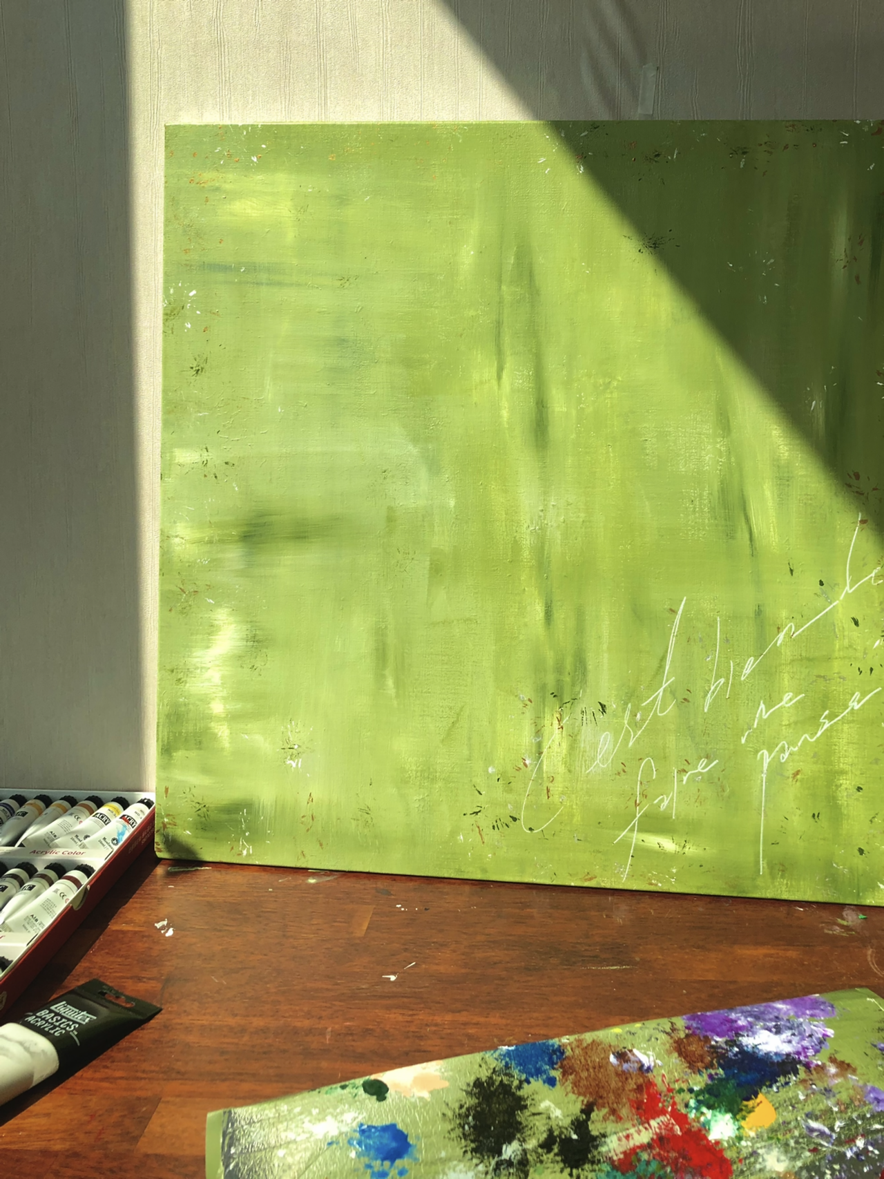 이 작품은 제가 작업한 작품 중 가장 여백이 많은 작품이에요. 사실 이 작품의 밑바탕에는 여러 색과 붓 터치가 존재했어요. 근데 그 작품을 계속 보고 있으니 피로감이 느껴지더라고요. 지금 생각하면 마음이 지쳤던 때가 아니었나 싶기도 해요. 그래서 가장 눈에 편안한 색을 골라 과감하게 덮는데, 그 과정에서 순간 해방감이 확 느껴지더라고요. 동시에 ‘아 이게 가끔은 나에게 필요한 여백인가..?’라는 생각이 들었어요. 그렇게 이 작품은 제 자신에게 하고 싶은 말인 ‘잠시 쉬어가도 괜찮아’라는 문구와 함께 시그니처 붓터치로 그림을 마무리했어요.