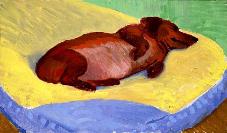 나초 역시 저렇게 잠을 잔다. 요즘은 도넛처럼 몸을 돌돌 말아서 잠들지만 정말 피곤한 날에는 누가 잡아가도 모를 모습으로 곤히 잠드는데 그때는 벌러덩 누워 배를 보인다. 가끔 꿈까지 꾸는데 그때는 네발을 움직이며 끙끙거리다가 짖기도 한다. David Hockney의 그림 속에서 보면 나초와 너무 비슷하니까 내게는 위로가 된다. 작가는 90년대 키웠던 애완견들을 따뜻하고 소중한 추억을 영원히 간직할 수 있는 작품으로 남겼다. 어쩌면 그건 작가가 할 수 있는 가장 멋진 방법으로 그들을 추억하는 일일 게다.