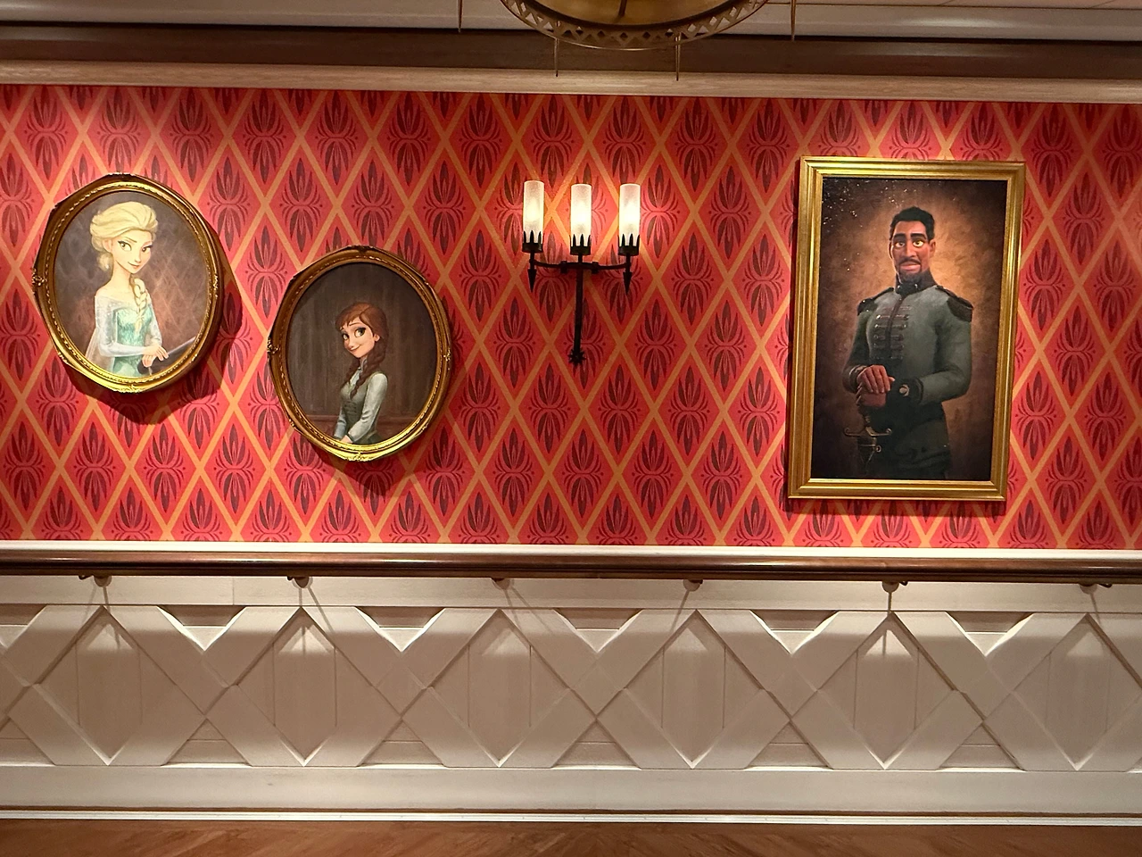 식당에 들어서자 디즈니 디테일에 다시 한번 소리 질러~ 프레고나르의 그네 그림부터 피터 브루겔 디 엘더의 결혼잔치의 그림을 디즈니화 하여 벽에 걸어놨다. 게다가 올라프의 돋보적인 초상화도 있으니 왕가의 품위를 이 음식점 복도에서 다 느낄 수 있다. 프로즌의 한 장면에 들어서는 느낌으로 만들어진 이곳에서 나는 매우 엘사와 애나를 하나도 닮지 않은 공주님들을 만났다. 하지만 괜찮다. 이해한다. 사람이 애나 엘사 닮기 힘들다.