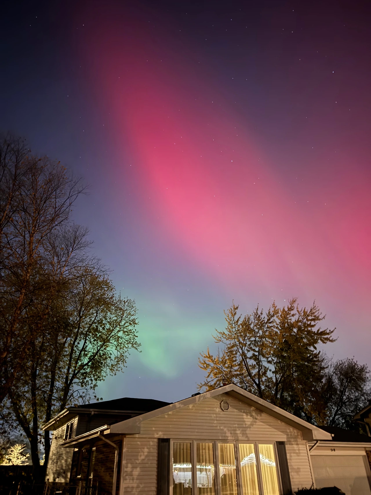 그때 나는 이석증으로 고생 중이었지만, 사방에서 날아오는 문자와 사진을 보며 결국 주섬주섬 옷을 챙겨 입고 밖으로 나갔다. 육안으로는 잘 보이지 않았다. 하지만 카메라를 들이대니 희미하게 붉고 푸른 빛이 잡혔다. 친구들이 보내준 그 압도적인 빛의 향연은 아니었지만, 내가 찍은 하늘도 나름의 아름다움이 있었다.