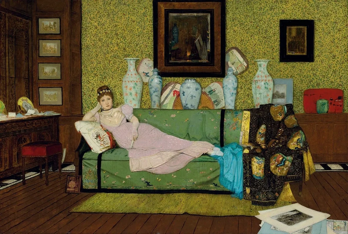 옅은 분홍빛 고운 옷을 입고 아름다운 것들로 주변을 가득 채워보지만 여자는 만족스럽지 않은 얼굴로 관객을 쳐다본다. 그녀의 표정에 욕망이 보인다. 더 소유하고 싶은, 아직 채워지지 않은 허기 같은 것 말이다. 아름다움에 둘러 쌓여있지만 더 이상 그 아름다움에 눈을 주지 않고 새로운 것, 다른 것, 내 수중에 없는 혹은 내 소유가 아닌 것을 향한 욕망은 이 그림 속 저 방이 앞으로 다른 것들로 채워질 것이라는 걸 예상하게 한다.