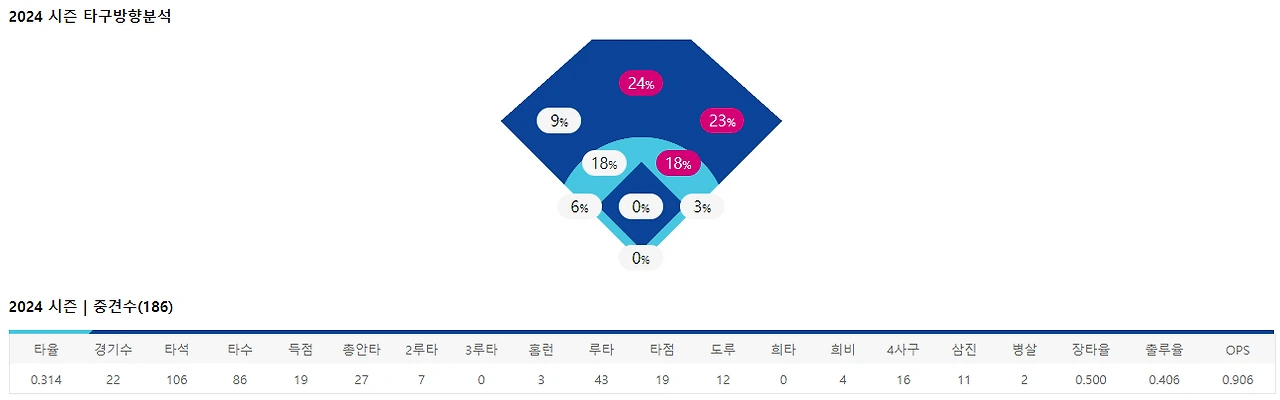 타구 분포 방향을 보았을때도, 고교 통산을 다 했을때 외야로 타구가 뻗을때 대부분 밀려서 나가는 듯 한 타구 분포도를 나타내는 것 으로 보아 약간은 배팅 타이밍이 밀린다는 듯 한 생각이 든다.